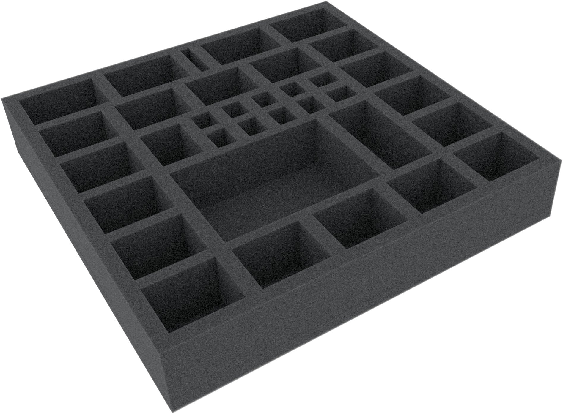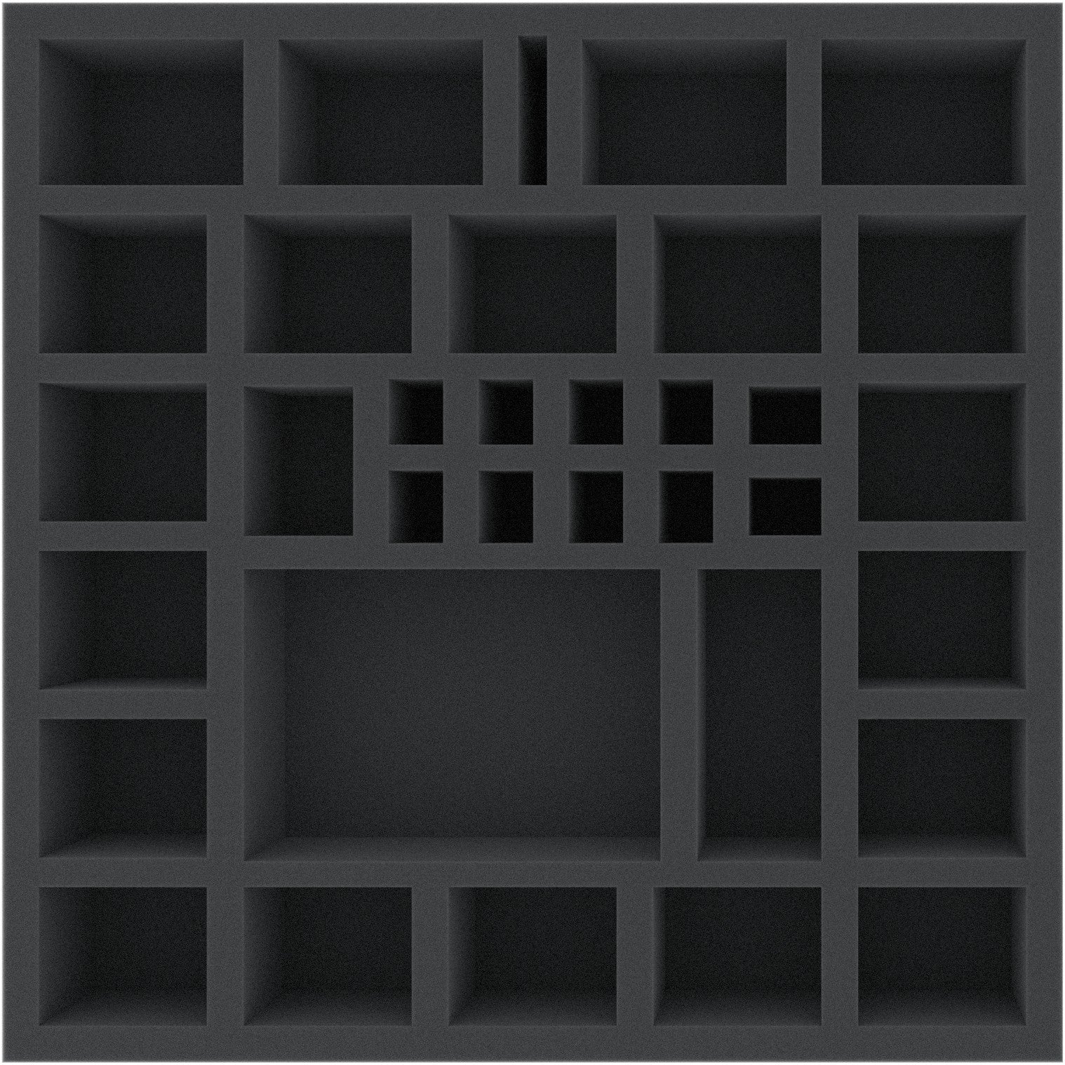 This foam tray has 34 compartments for the safe and orderly storage of board game material like miniatures, tokens and dice. The fine-pored foam provides reliable protection against damage.