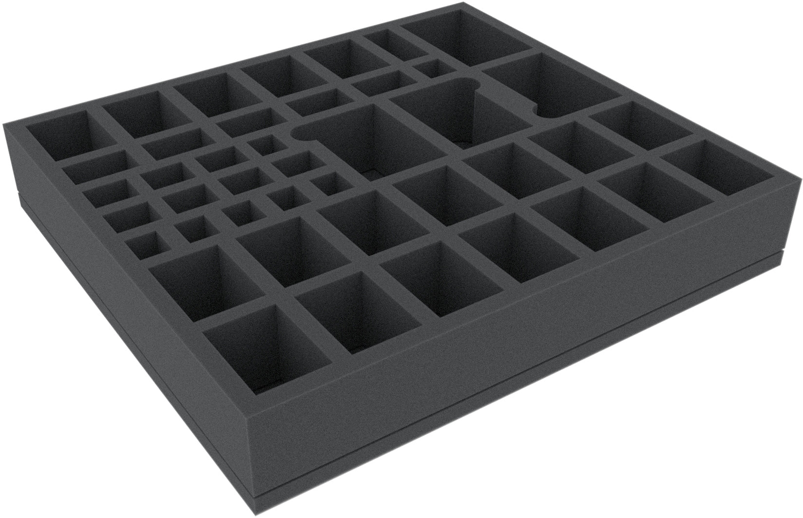 This foam tray is divided into 43 compartments of different sizes. It is particularly suitable for safe storage of miniatures and game material in board game boxes.