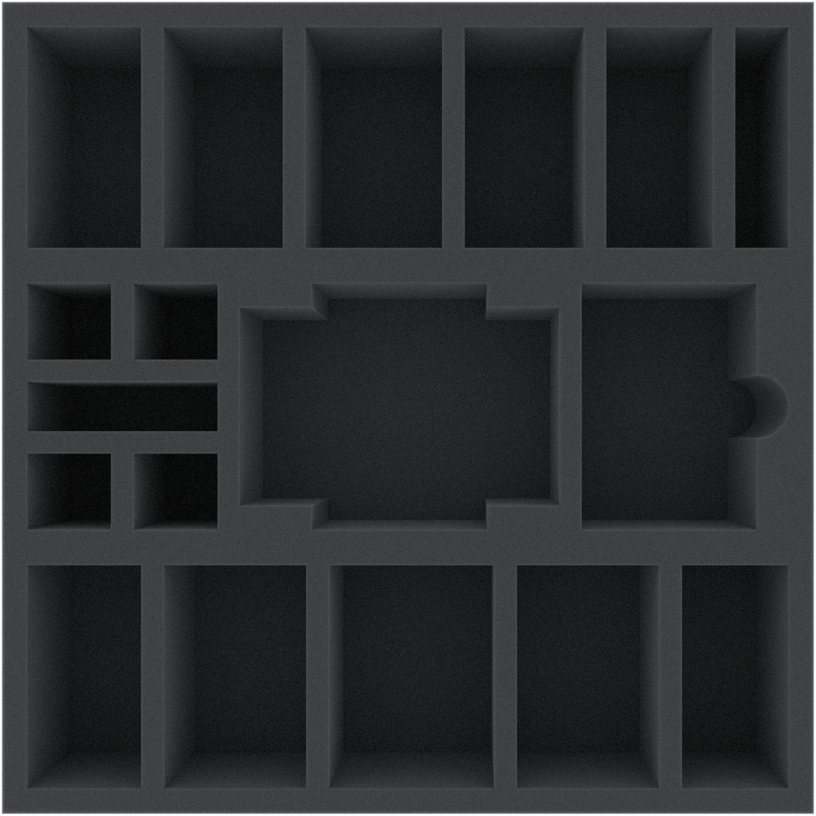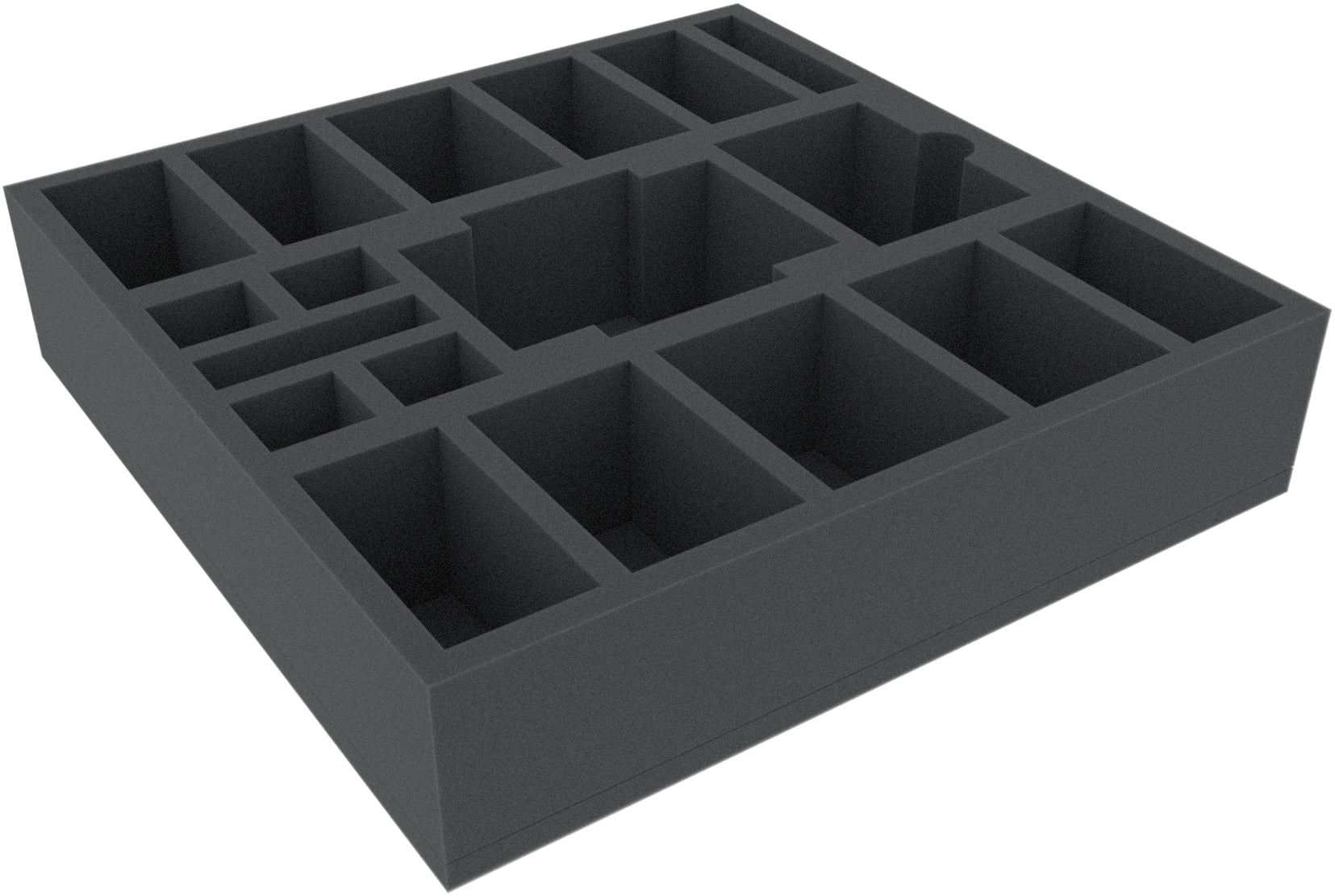 This foam tray is divided into 18 compartments of different sizes. It is particularly suitable as an insert for the safe storage of miniatures and game material in the original board game boxes.