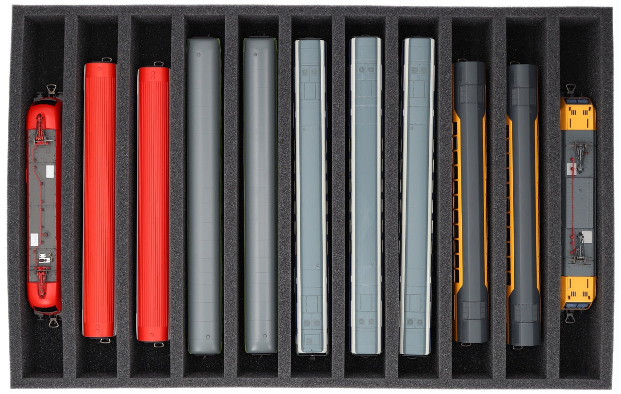 Several trains and carriages can be stored next to each other in one compartment. In order to prevent collision or unintentional coupling, we offer suitable foam spacers (HS040A002, HS020A001) to separate your model trains.