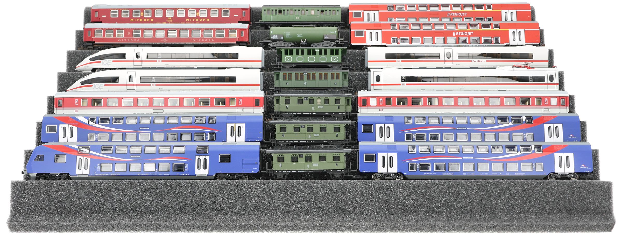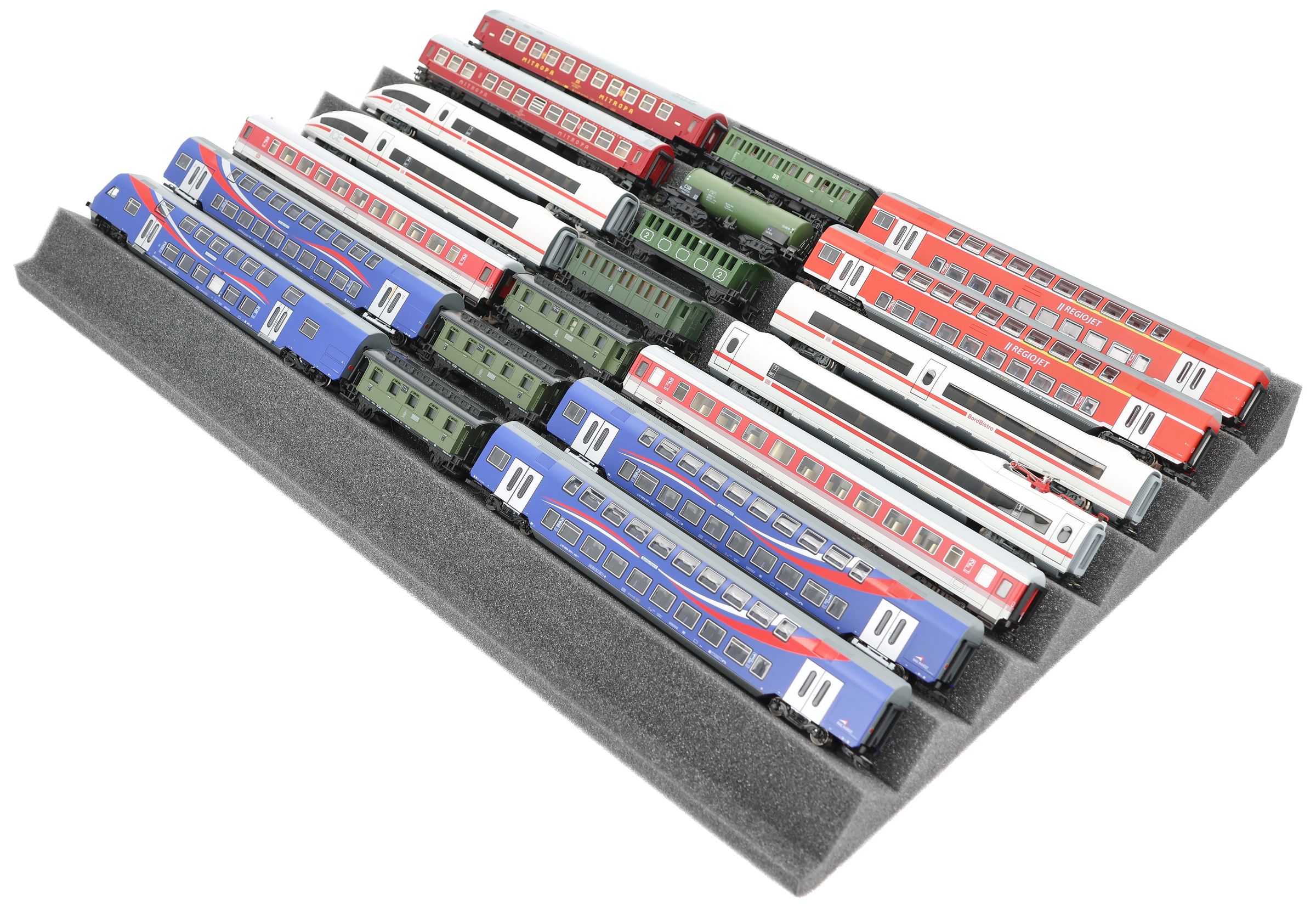 Several trains and carriages can be stored next to each other in one compartment. In order to prevent collision or unintentional coupling, we offer suitable foam spacers (HS025A001).