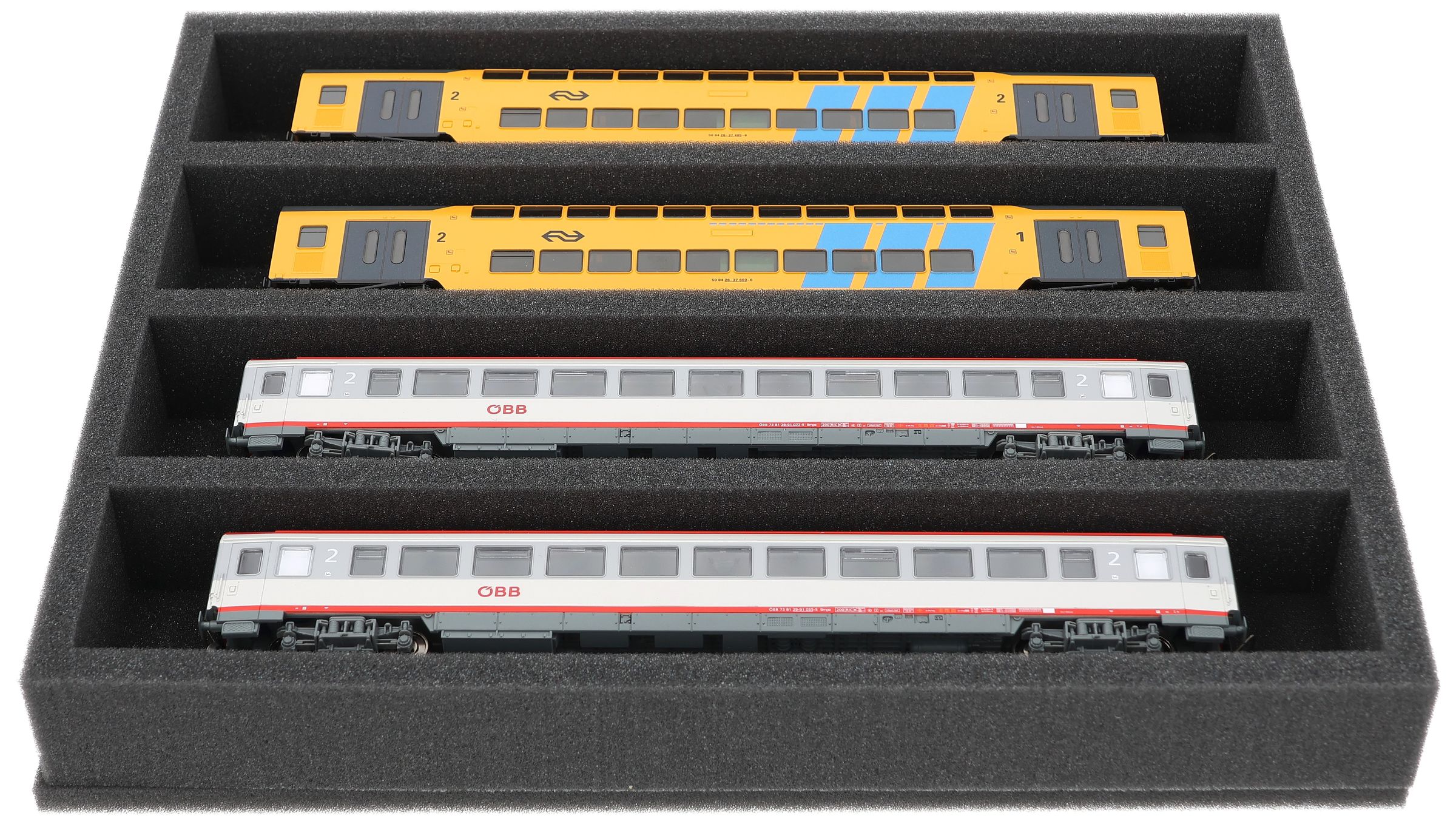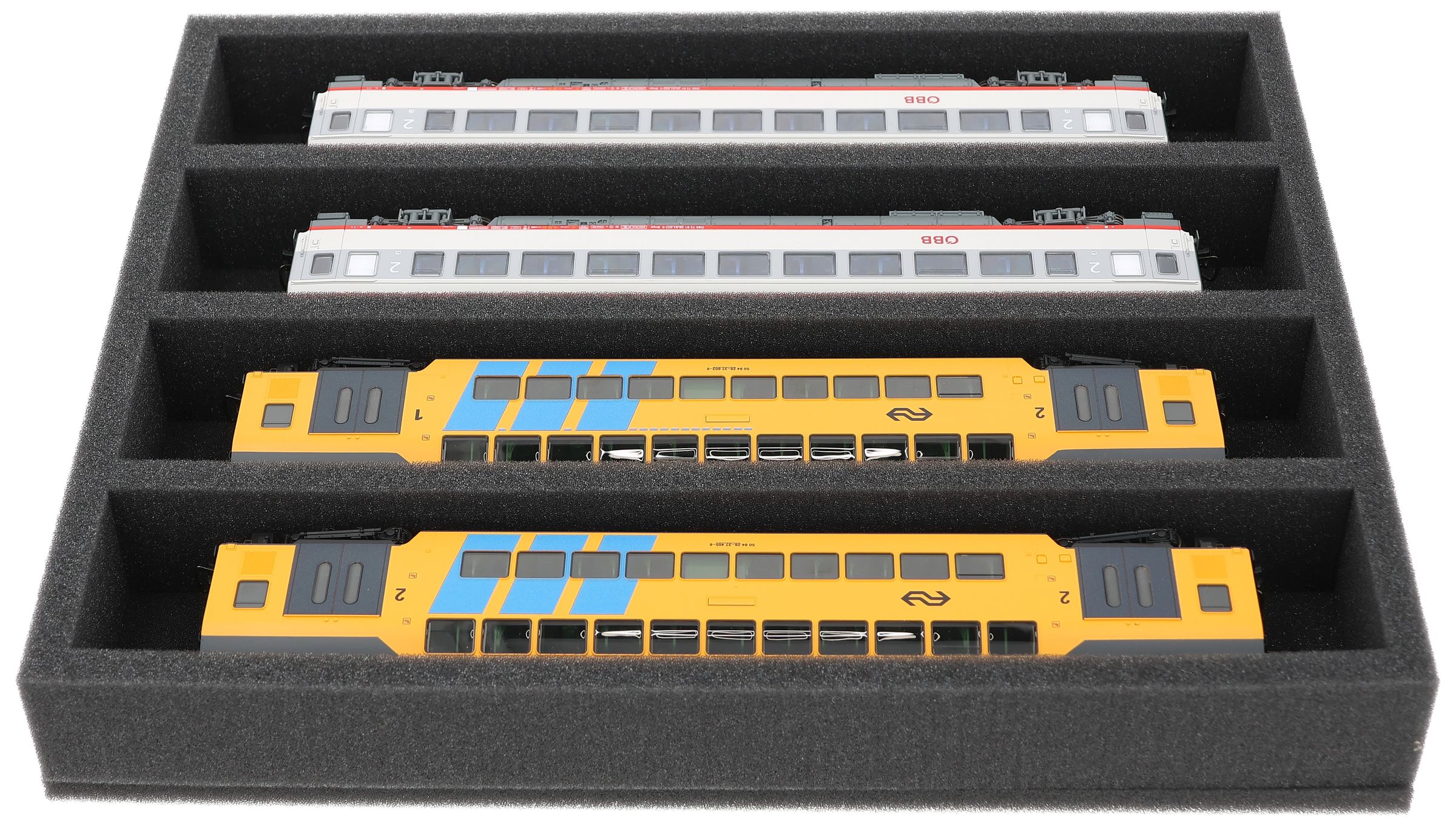 Several trains and carriages can be stored next to each other in one compartment. In order to prevent collision or unintentional coupling, we offer suitable foam spacers (HS040A002, HS020A001) to separate your vehicles.