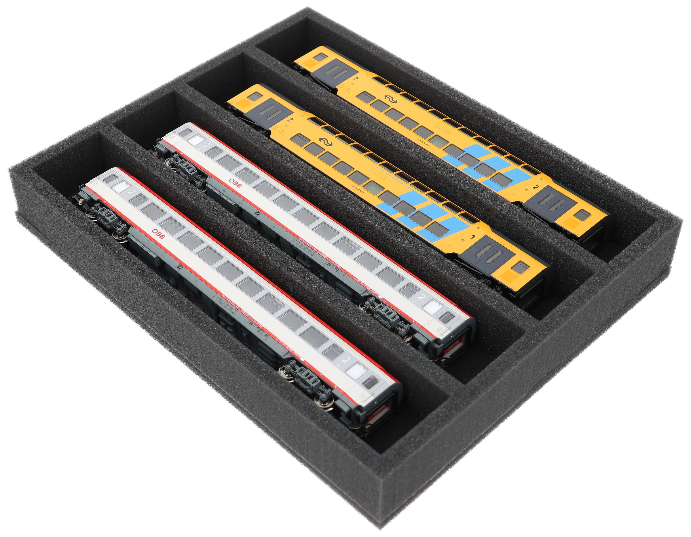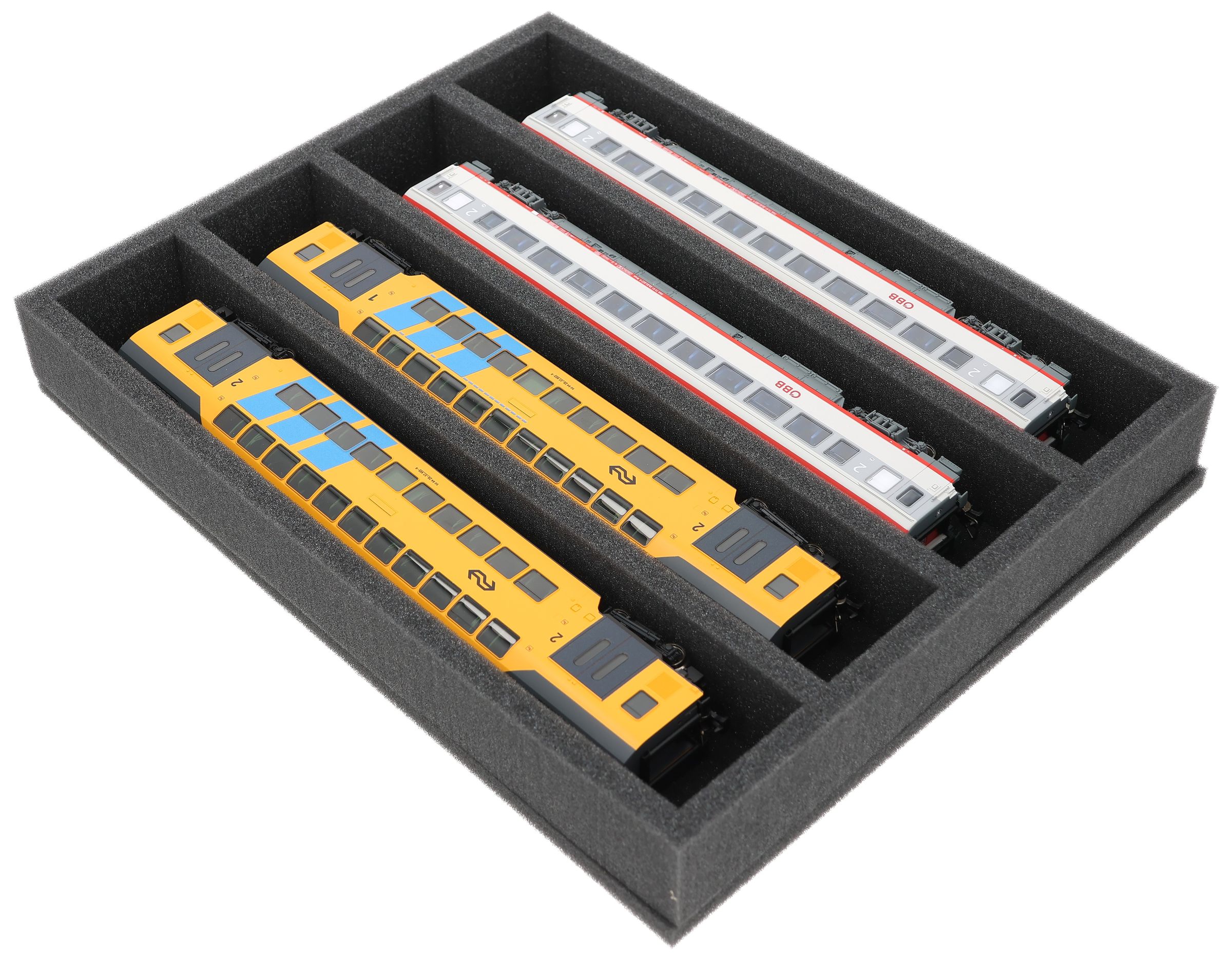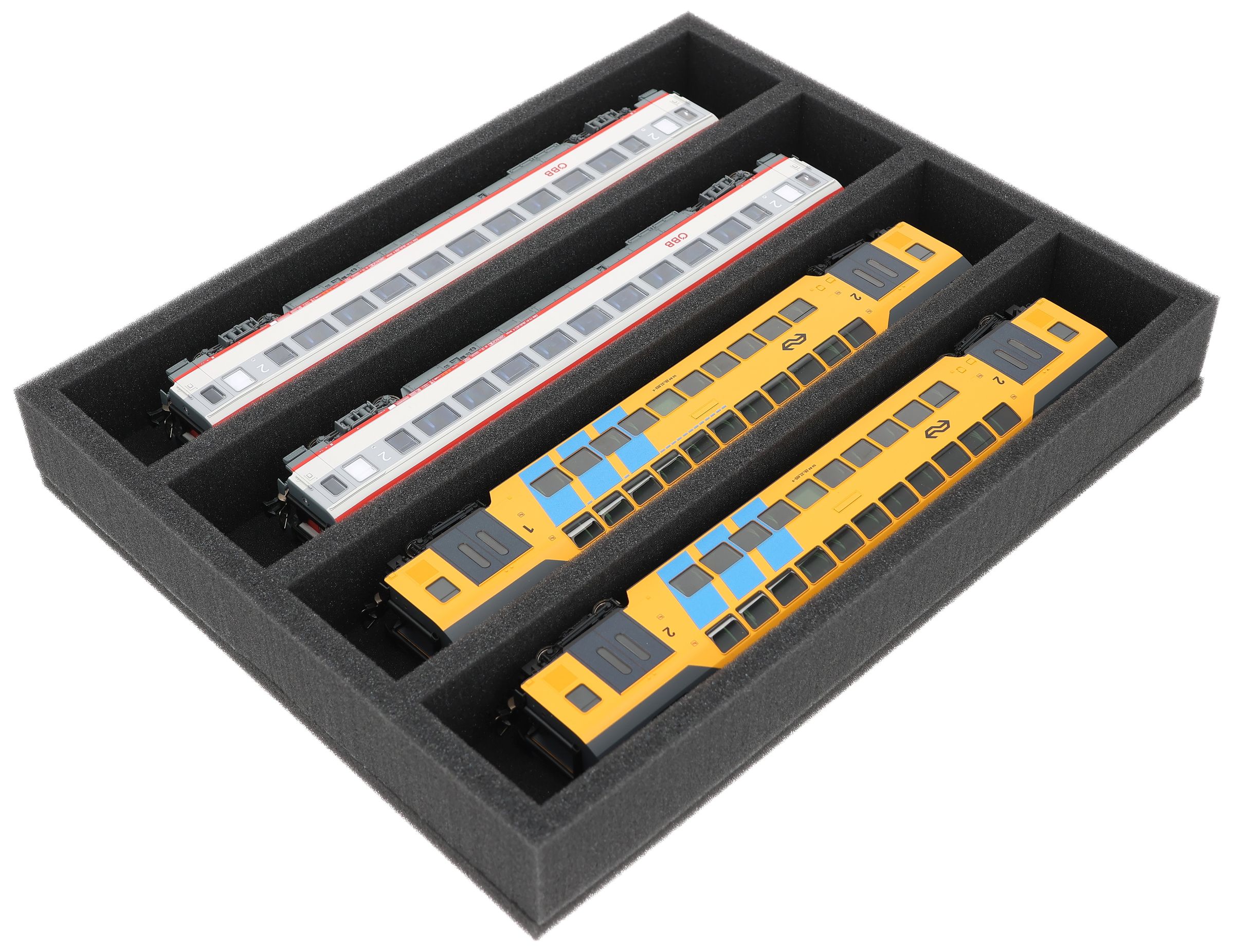 FS050A005 Foam inlay H0 Gauge - horizontal - 4 slots for model railway locomotives, wagons and vehicles
