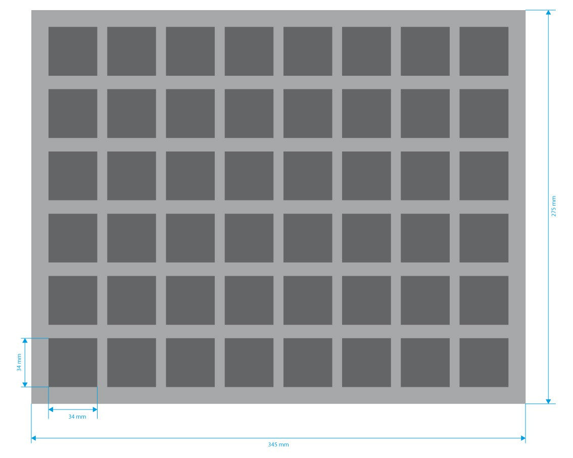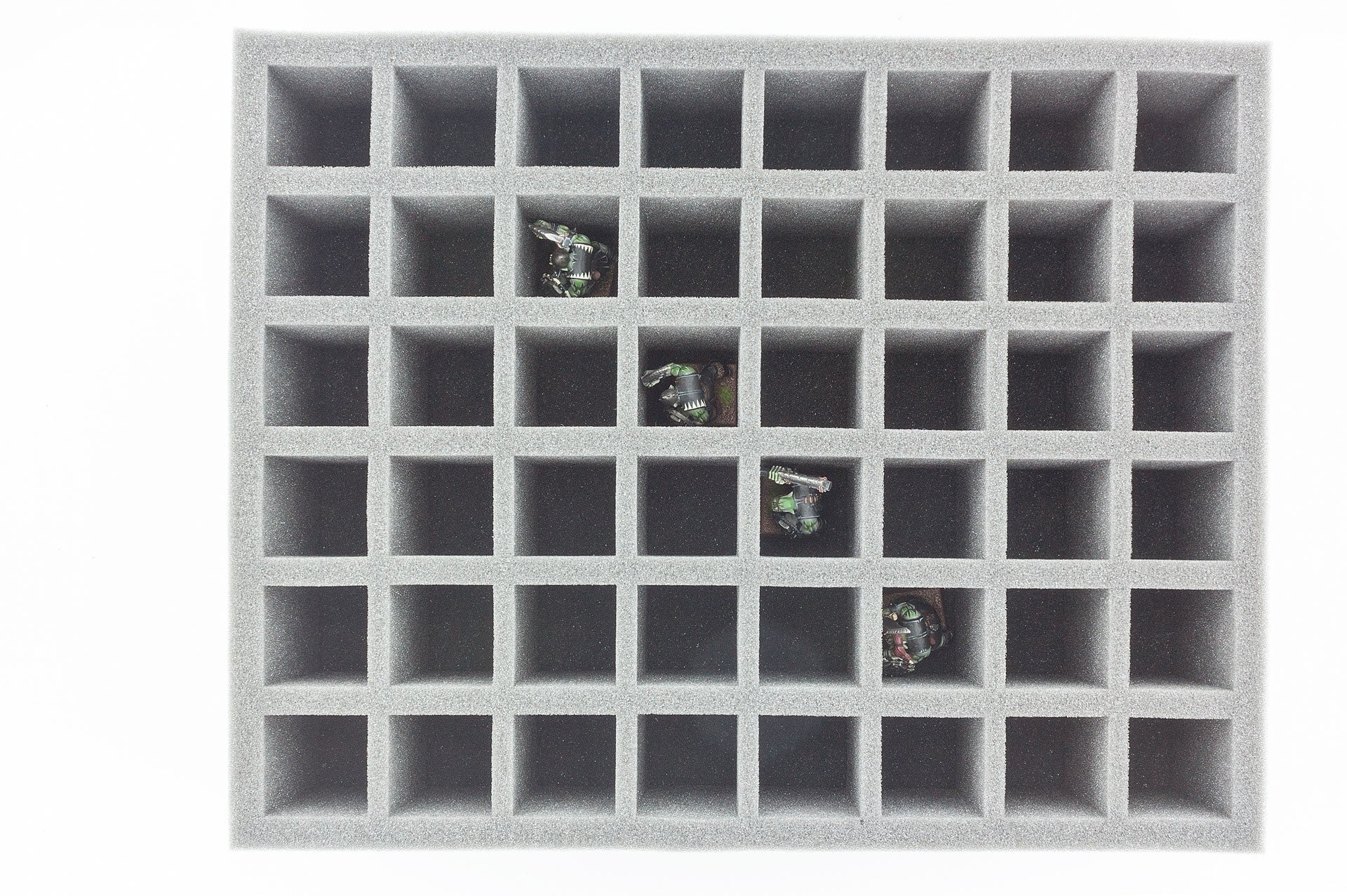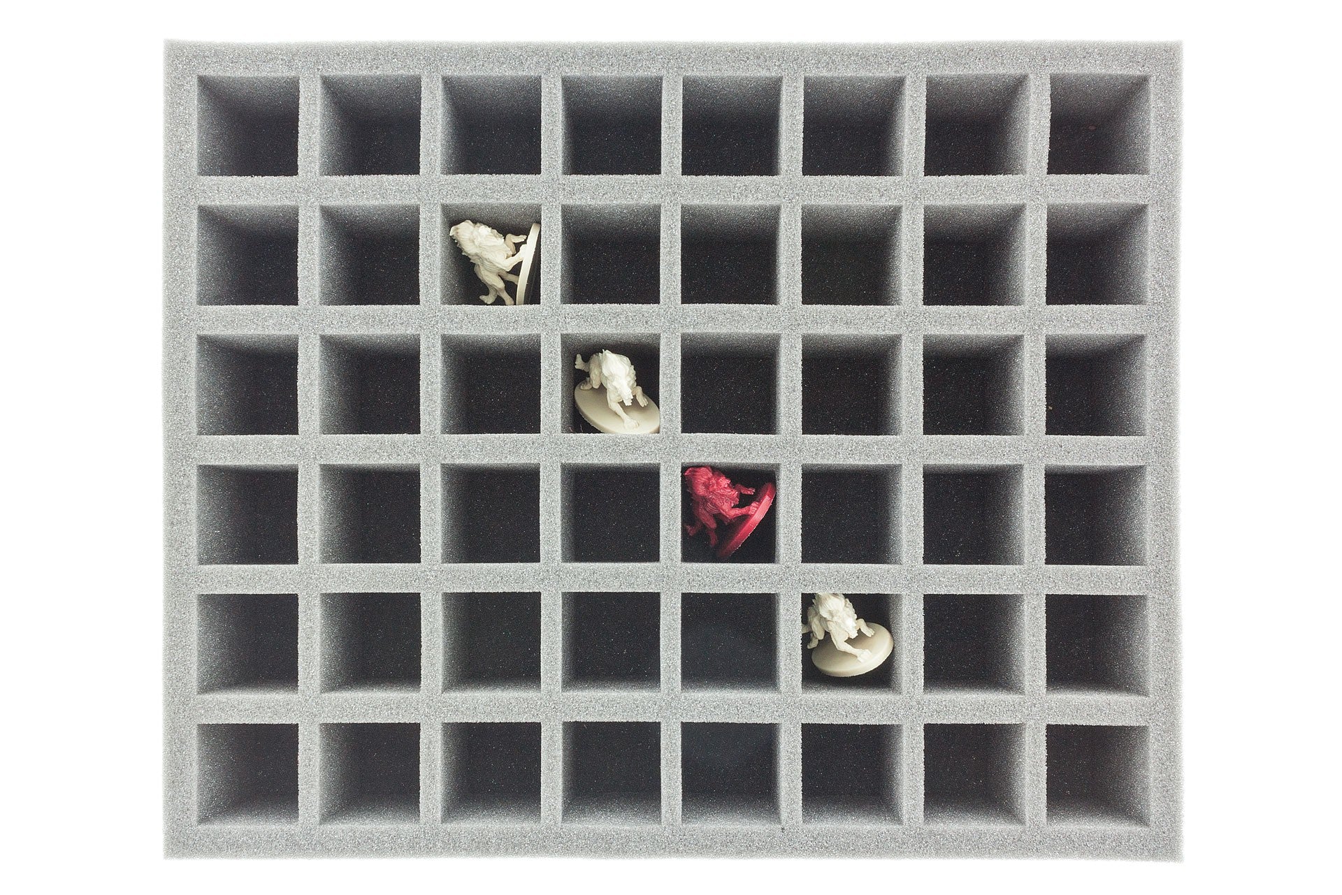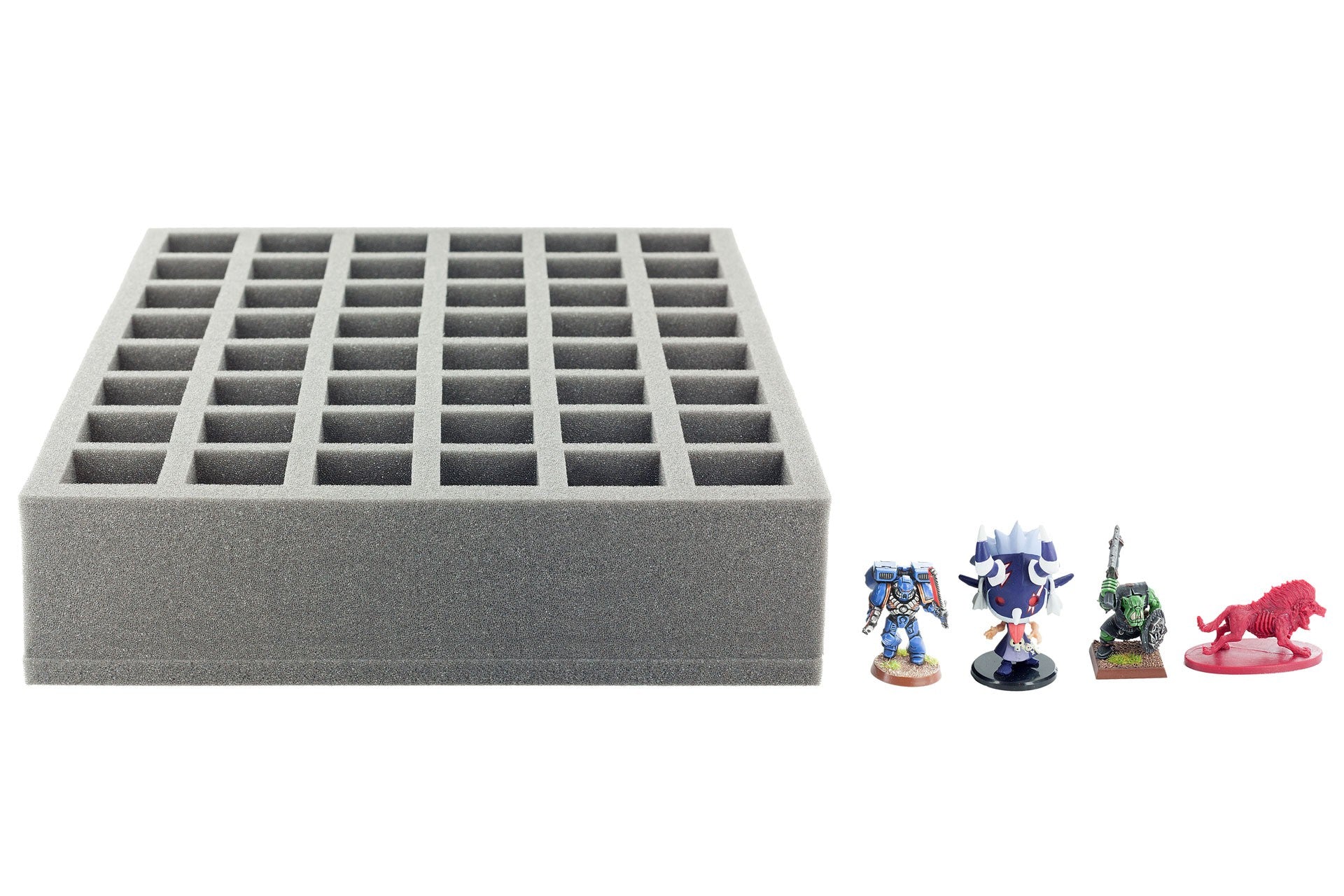 Bandeja de espuma lista para usar con 48 compartimentos cuadráticos (34 mm x 34 mm x 60 mm de altura) para todas las miniaturas con una base de hasta 30 mm de diámetro / longitud lateral. Esta bandeja de espuma se ajusta también a los Botes de Pintura de los Colores de la Ciudadela de los Talleres de Juegos, Pinturas de Modelos de Vallejo o Pinturas de Guerra de los Pintores del Ejército.