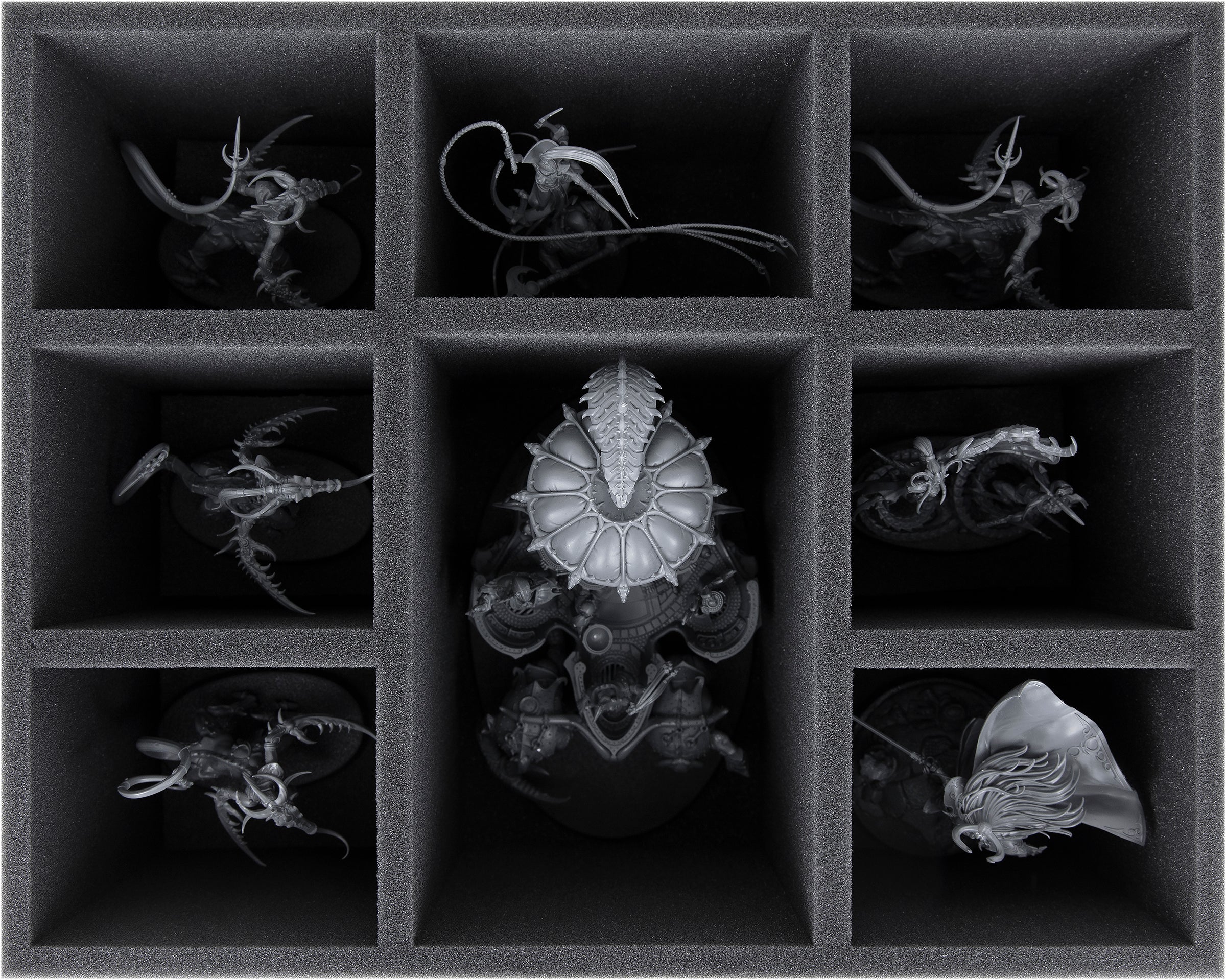 On this Feldherr foam tray you have space for up to 8 miniatures of your army. The insert is especially suitable for storing the Sigvald, Prince of Slaanesh, The Contorted Epitome, Fiends, Glutos Orscollion, Lord of Gluttony and similar sized models.