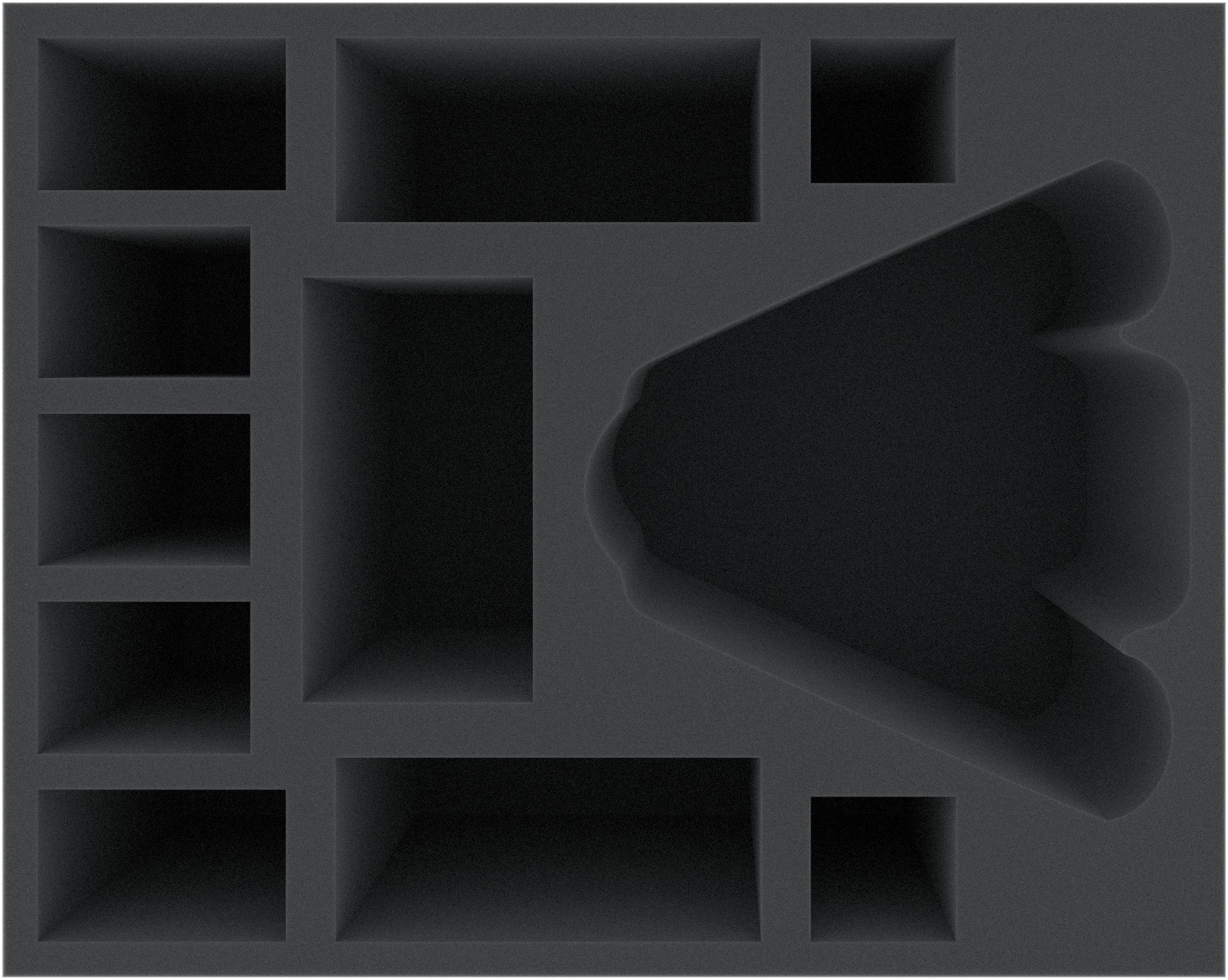 The Full-Size foam tray has the dimensions: 345 mm x 275 mm x 145 mm total height (135 mm usable height + 10 mm foam base).