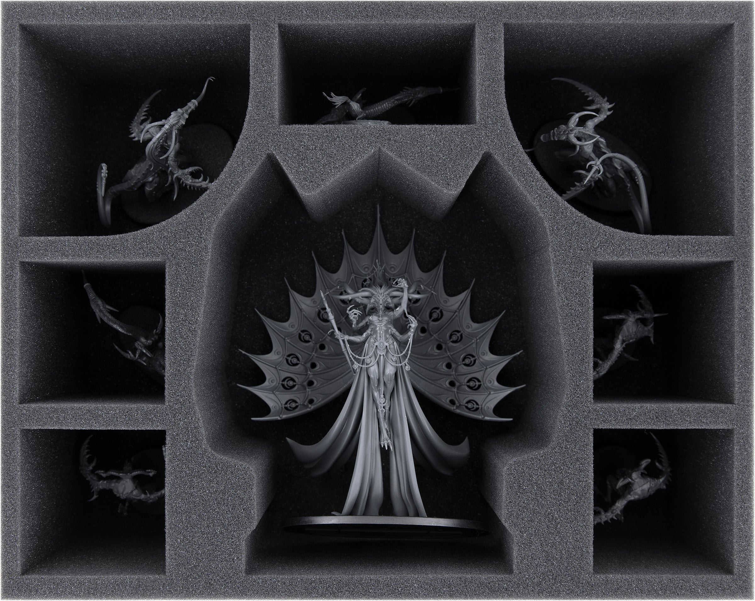 Mighty wings and long swaths of fabric make the beautifully crafted figure float in the air. Finest jewelry adorns the body and the four arms end in long thin claws. Some details are so finely modeled that jewelry or claws could break just from looking at them. To protect the nightmarish beautiful model from damaging influences, there is this matching Feldherr foam tray. Here you can safely store your incredible miniature.