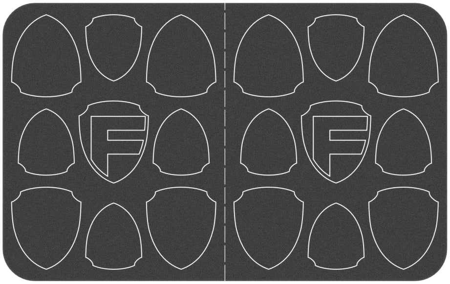 This Feldherr foam tray contains 18 Feldherr Supporters - all shield-shaped and 2 with Feldherr logos.