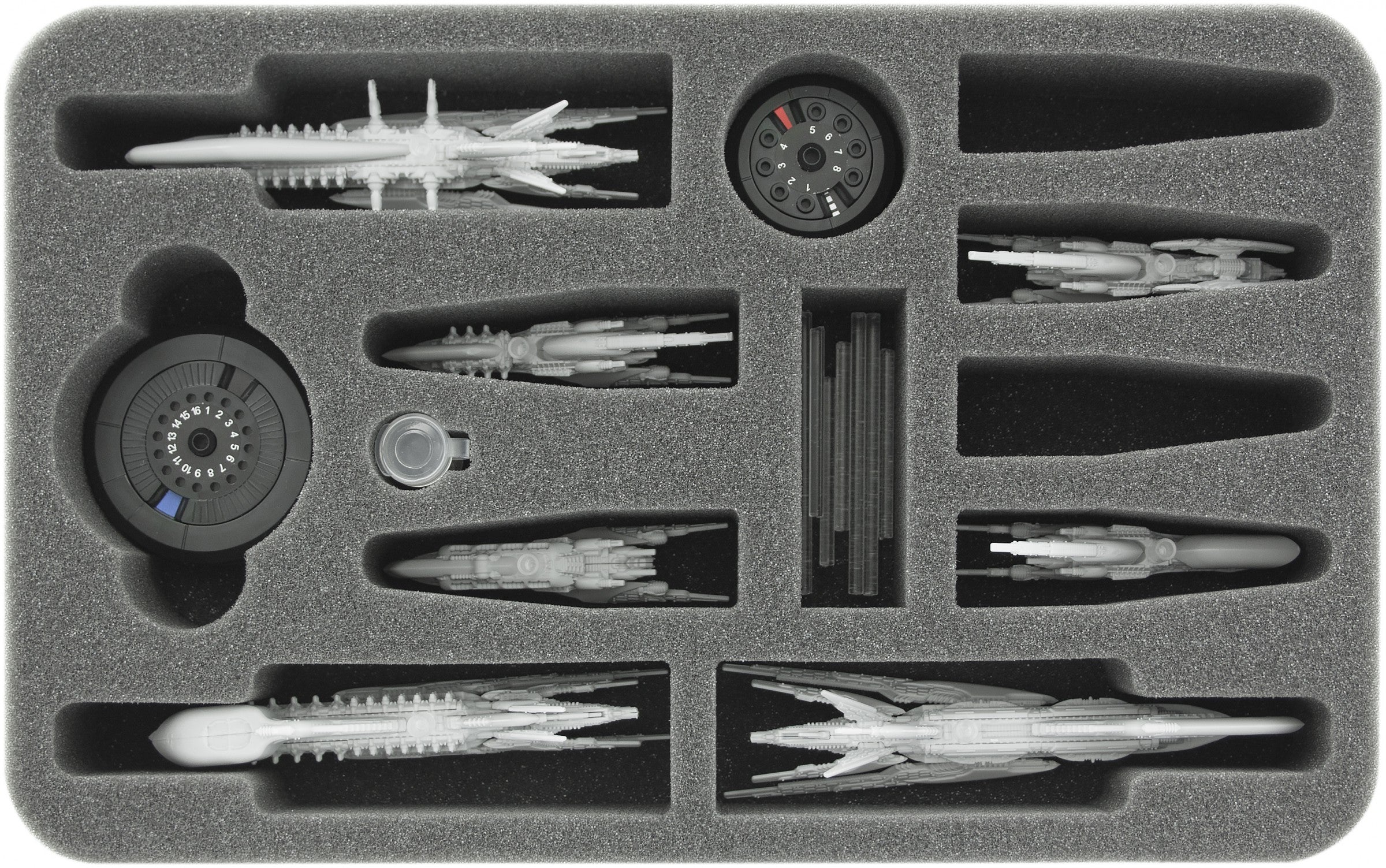 The foam tray provides space for 3 Cruisers and 6 Frigates of the Post-Human Republic. On the tray there are 4 additional compartments for playing material. In addition a FREE capsule for the damage pegs included!