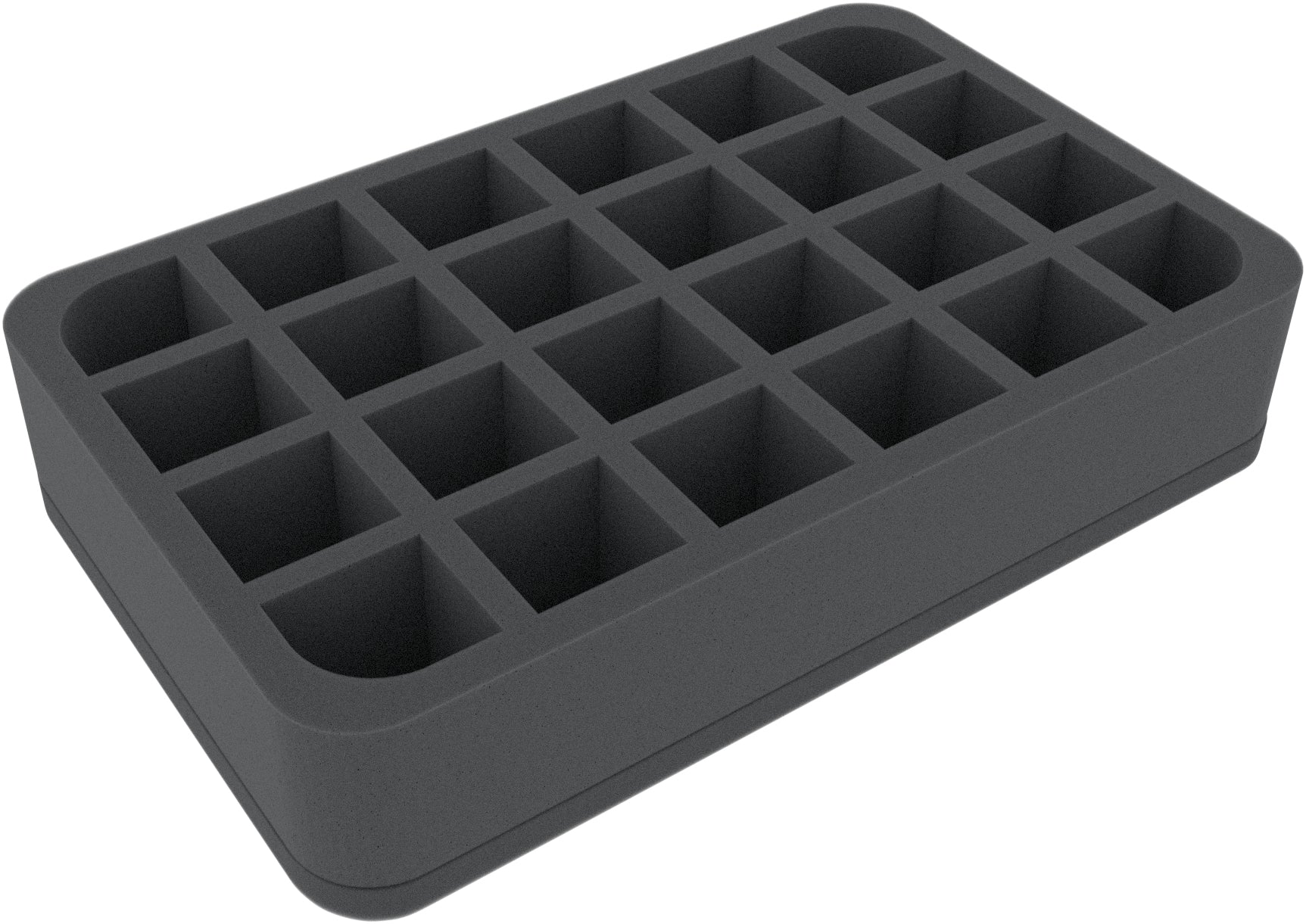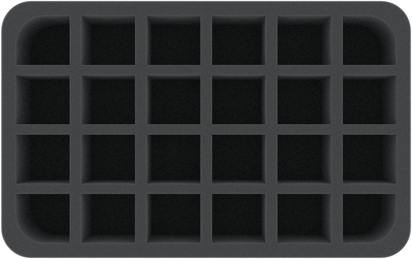 This Half-Size foam tray is divided into 24 compartments of the same size. It is particularly suitable for the safe storage of small to medium-sized figures for various board games and tabletop systems. Game material or other small parts can also be neatly stowed here.