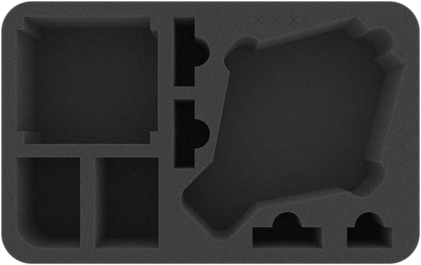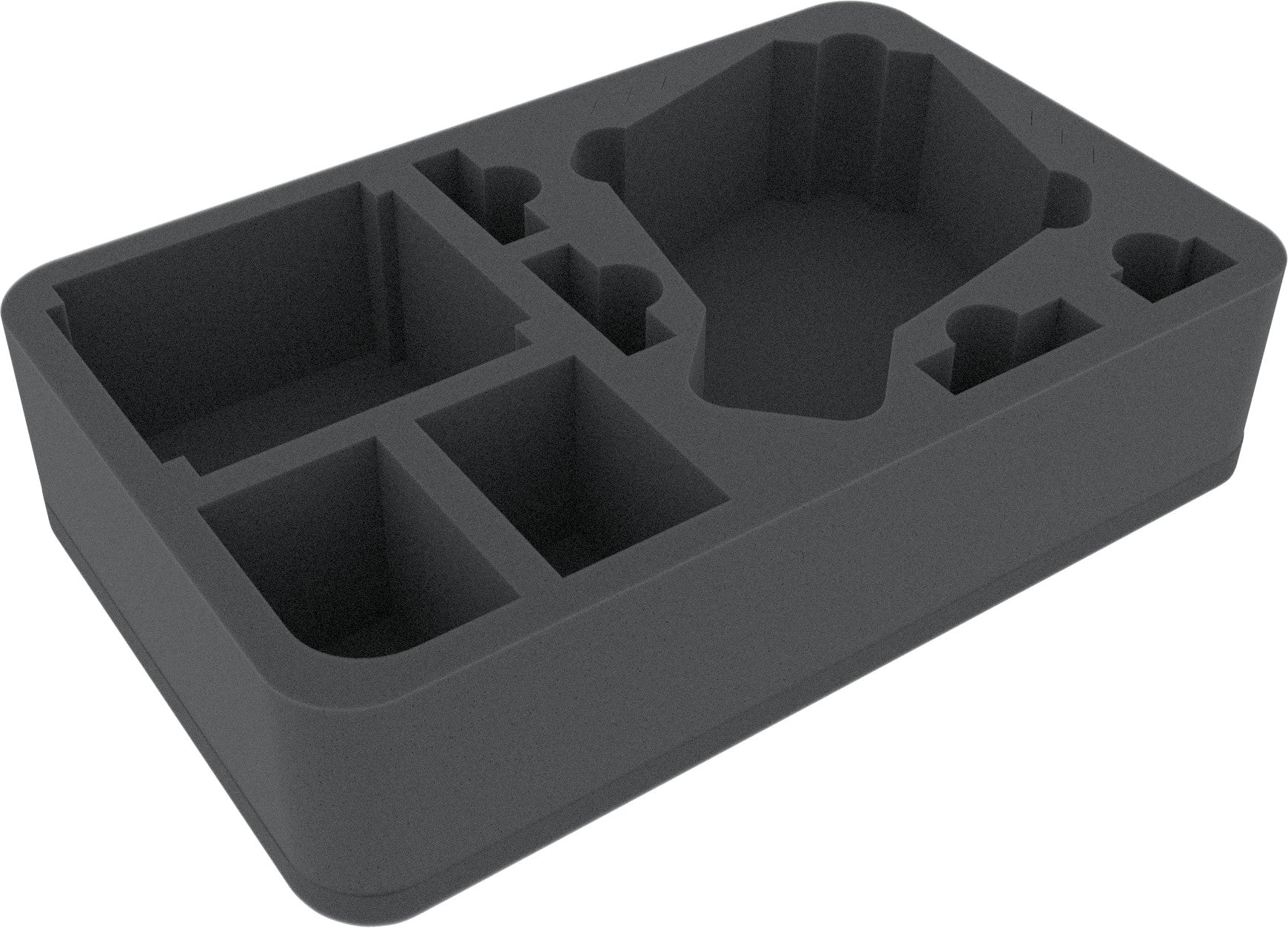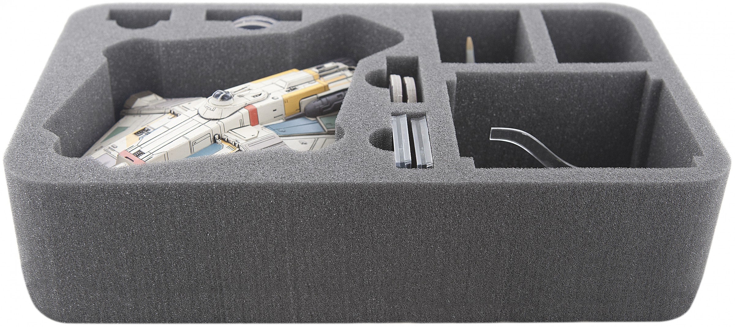Esta bandeja de espuma Feldherr Half-Size fue diseñada especialmente para el Star Wars X-Wing Ghost. Un modelo del VCX-100 puede almacenarse y transportarse de forma segura con este inserto. Además, puedes poner hasta dos púgiles. Por supuesto, la bandeja de espuma también ofrece espacio para los accesorios. El soporte de la base se puede hundir en las ranuras transversales designadas.