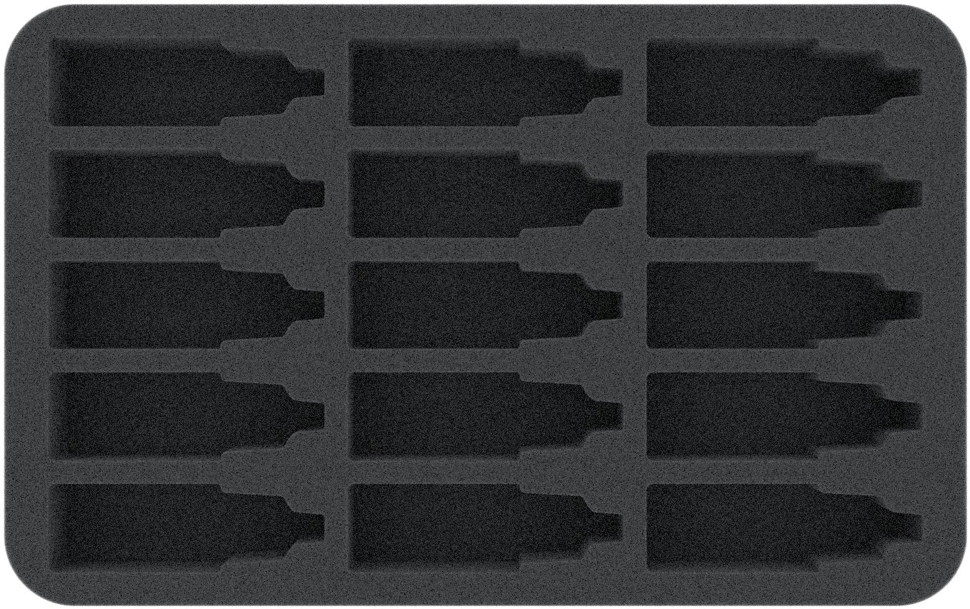 The tray has 15 compartments to help you organize your paint collection. The compartments are designed for Vallejo or Army Painter bottles, but will also hold (same-sized) bottles of other brands.