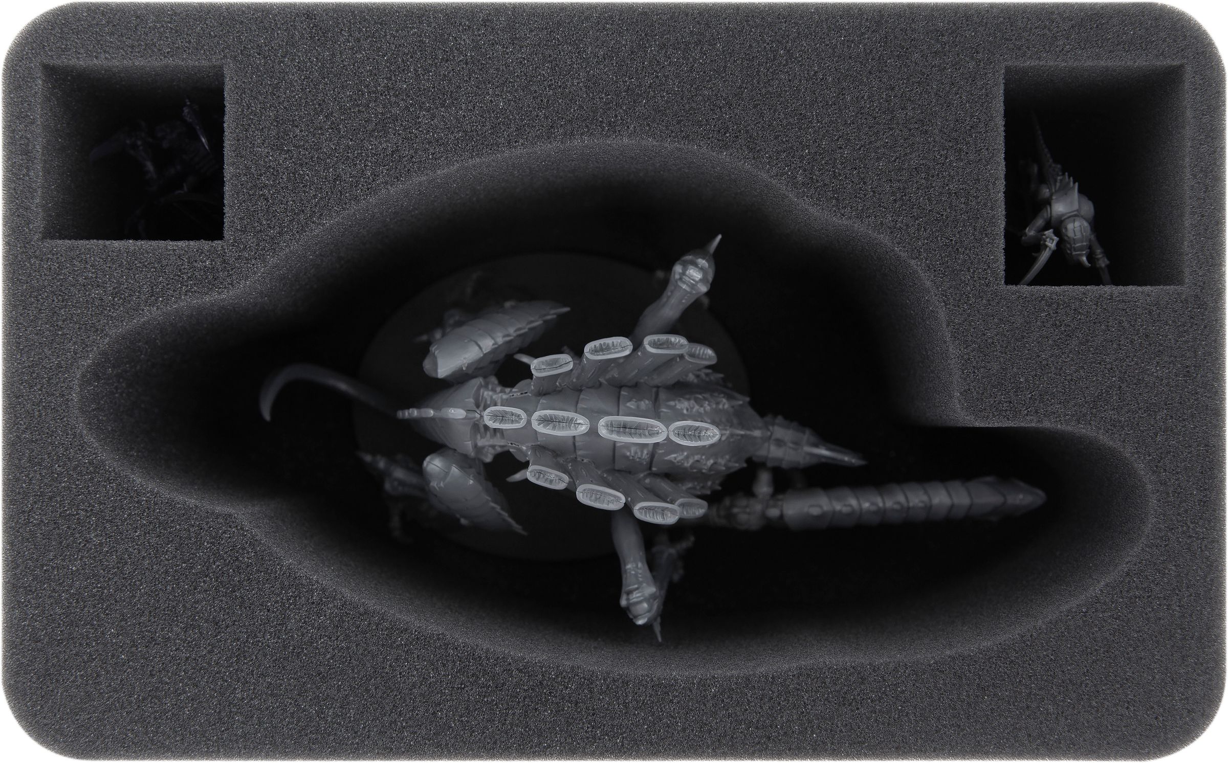 A large, miniature-tailored compartment houses the Tyrannofex of the Tyranids and thus provides optimum protection for this impressive miniature. The soft foam not only protects the sensitive details, such as the claws or the rupture cannon, but also the colors of the finished miniature remain unharmed.