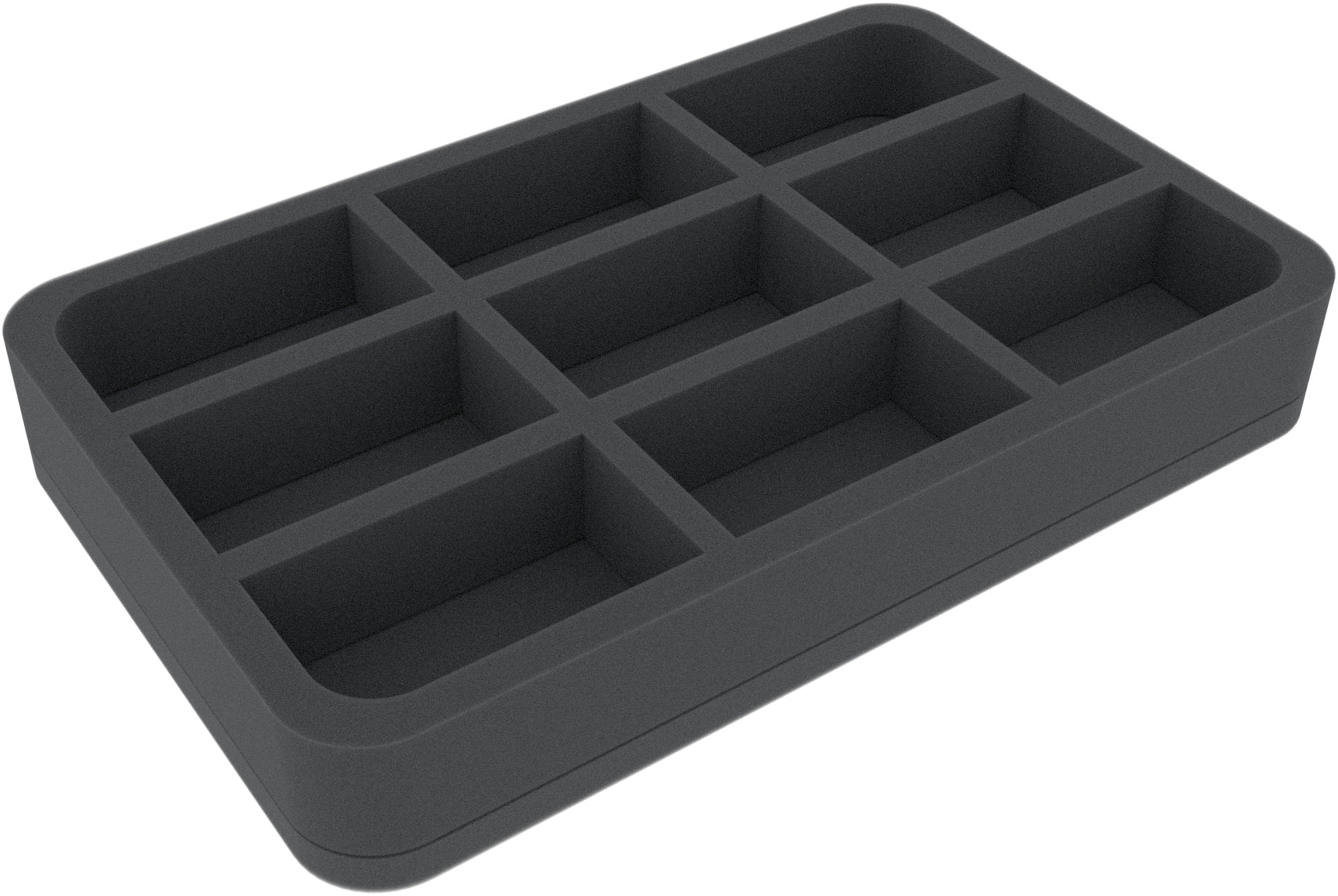 This Half-Size foam tray is divided into 9 compartments of the same size. It is particularly suitable for the safe storage of small to medium-sized figures for various board games and tabletop systems. Game material or other small parts can also be neatly stowed here.
