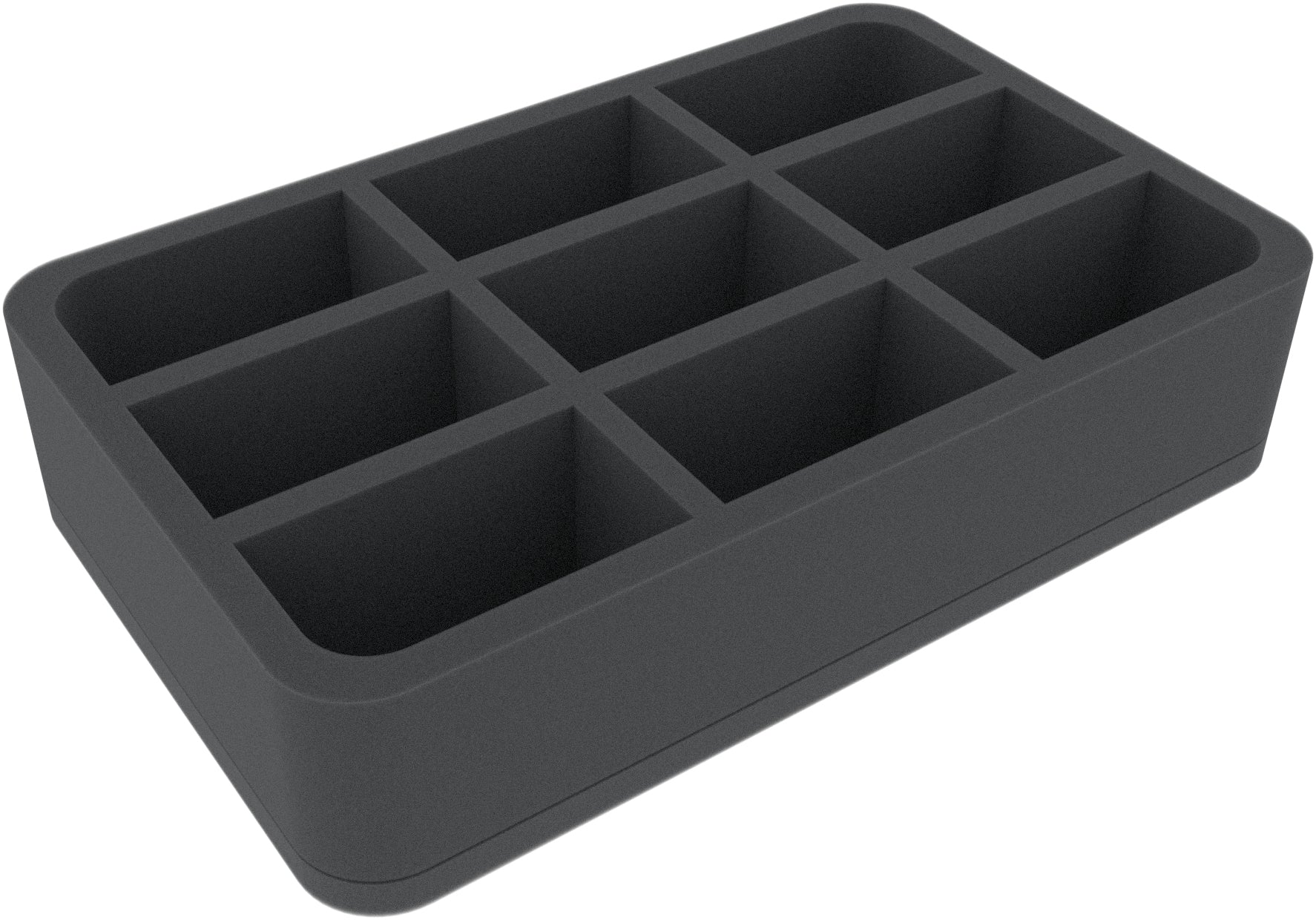 This Half-Size foam tray is divided into 9 compartments of the same size. It is particularly suitable for the safe storage of small to medium-sized figures for various board games and tabletop systems. Game material or other small parts can also be neatly stowed here.