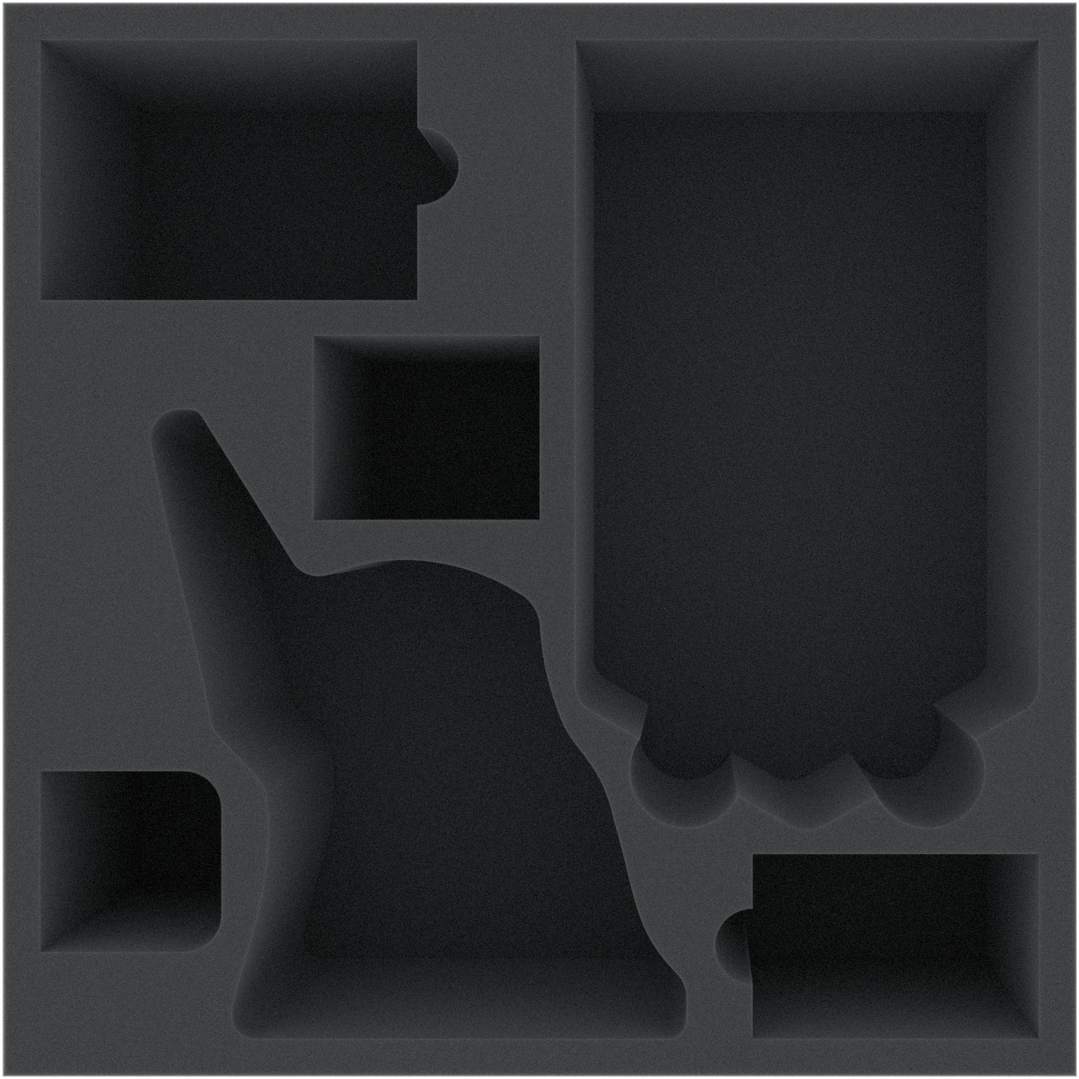 The foam insert for the "Crono" expansion is divided into 6 compartments. The miniature of Crono is housed in a large, miniature-cut compartment. Thanks to the exact cut, the figure remains in its softly padded position even during transport. Crono's weapon and other sensitive parts are best protected against damage here.