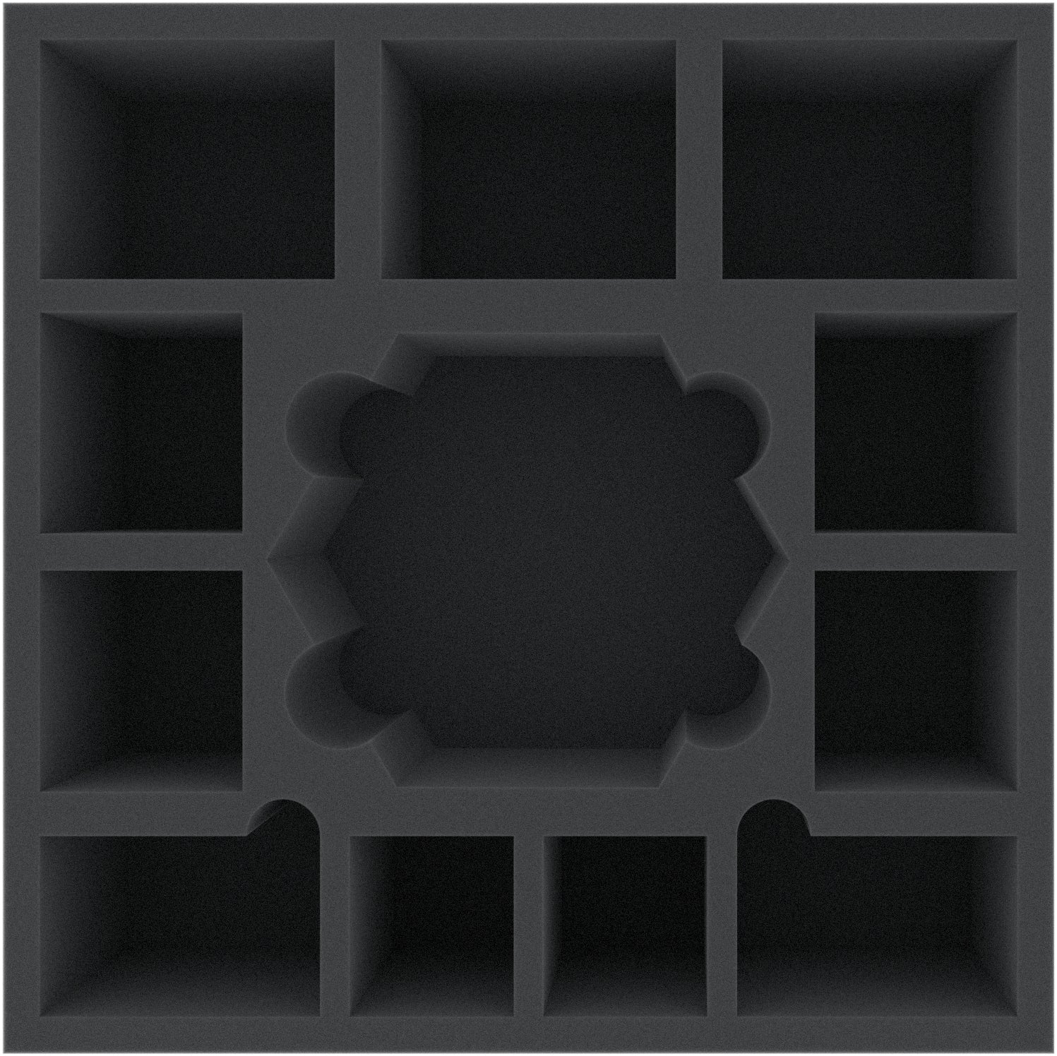 The large Evocations of the core game can be accommodated in the upper 85 mm high foam tray. The three Malacoda, as well as the Cerbero and the Bone Knights, are assigned their own custom-fit compartments. This ensures that the fine detailed miniatures remain safely in place even during transport.