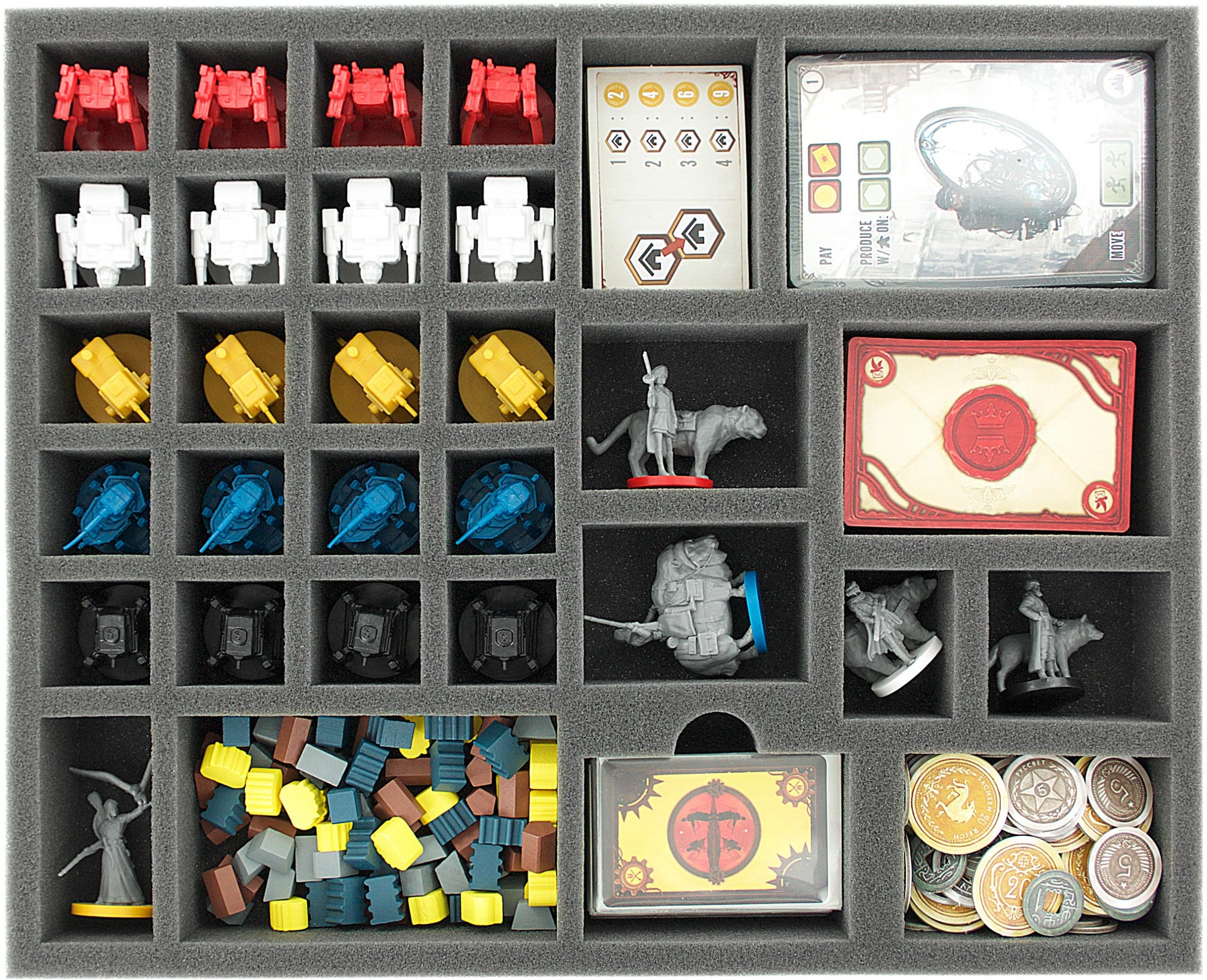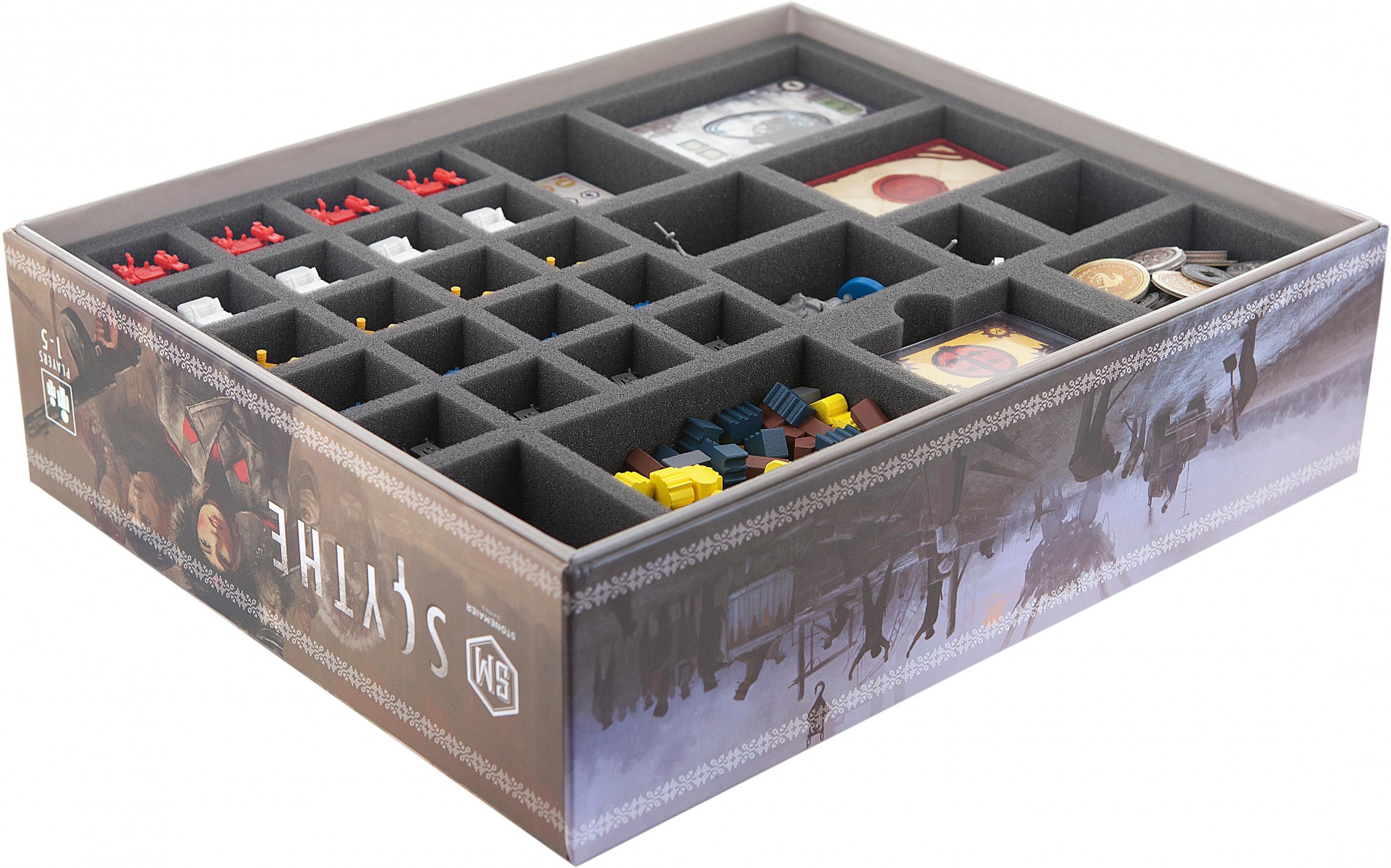 Protective foam tray for the original board game box of the Scythe core game. Foam tray provides a great solution for protecting all figures and tokens from the original board game box. For optimal protection there is an additional 10 mm foam topper included.