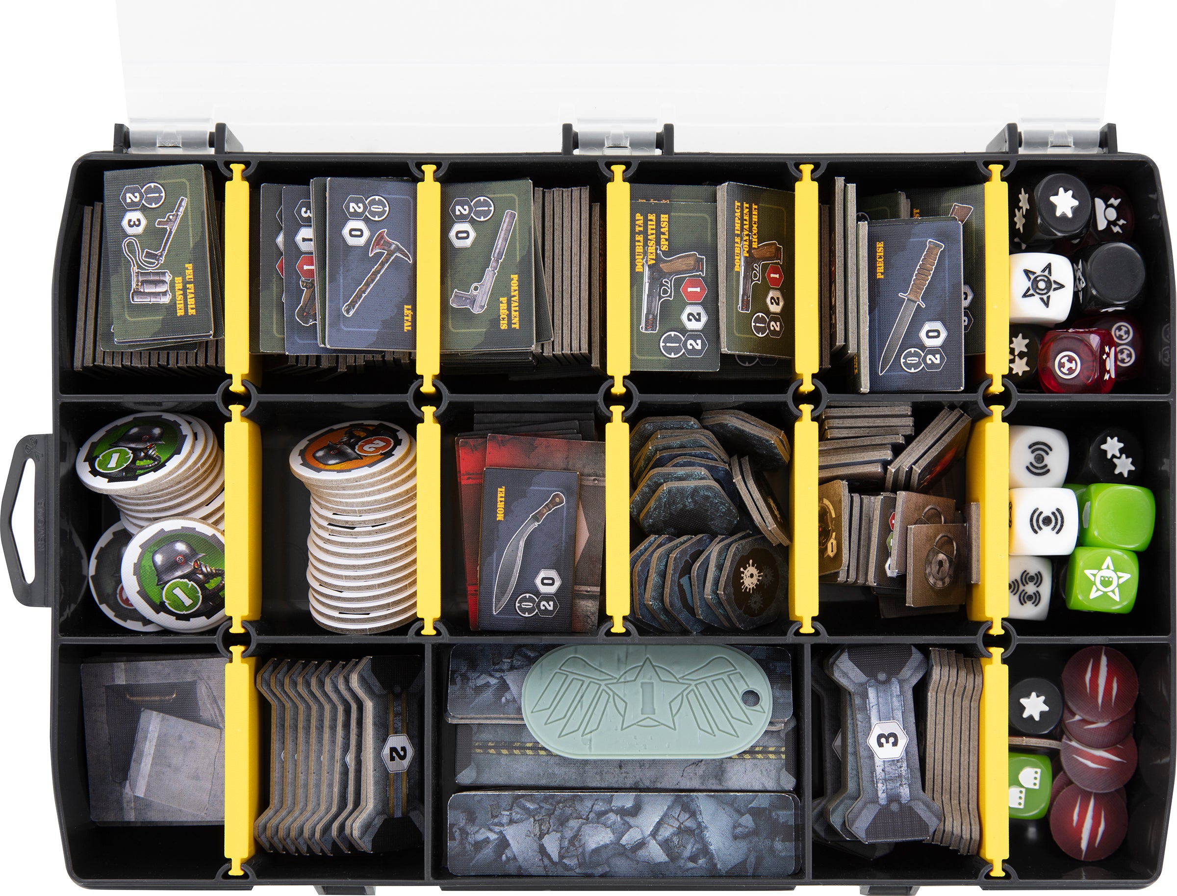Individual foam inserts with special compartments for the cards, as well as two assortment boxes for small pieces of game material, such as dice, tokens and items, help you to keep track of your game material at all times. Alien Items, Wound Tokens and Action Cards are thus quickly at hand and the time and nerves you save for the game setup can be invested in your missions instead.