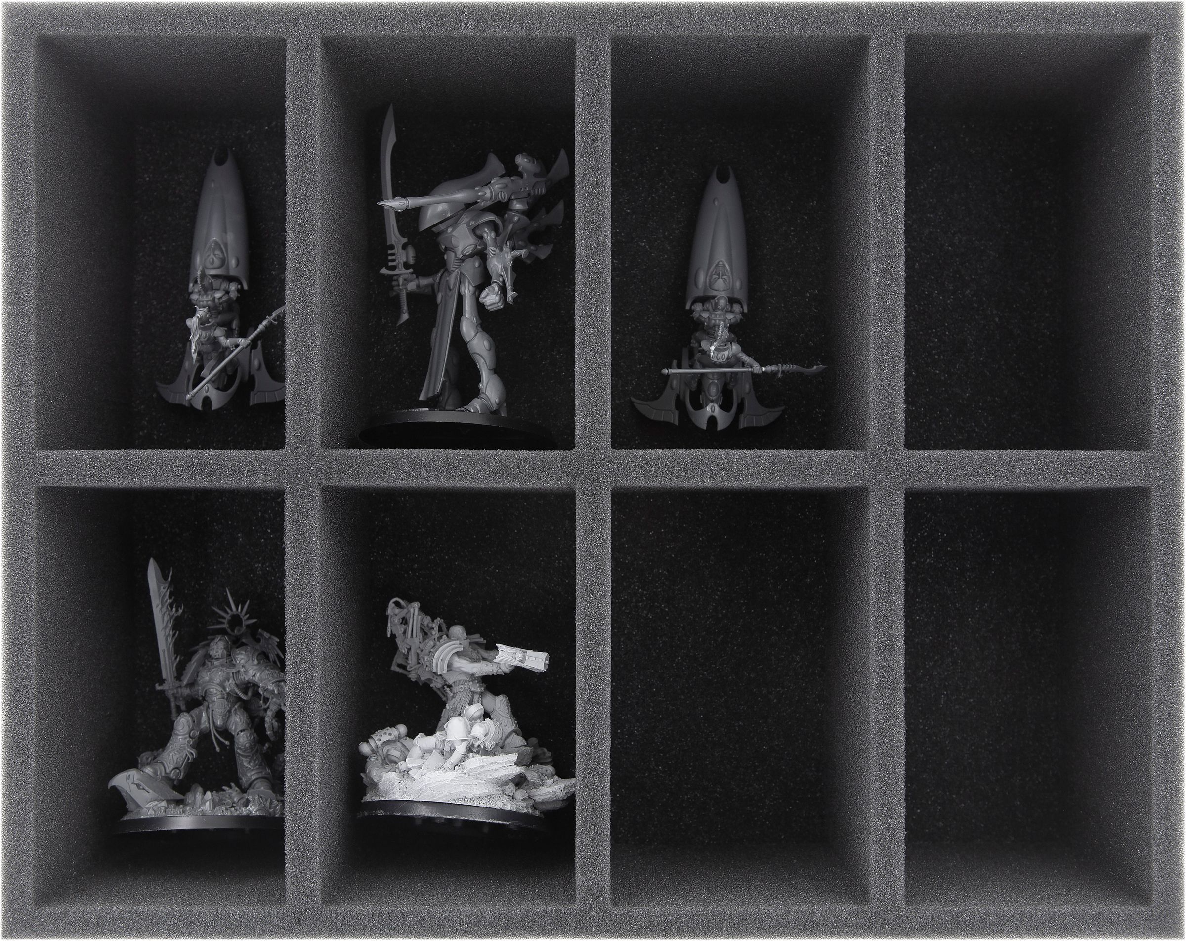 In the 8 large compartments of this Full-Size foam tray you can neatly stow the larger miniatures of your Craftworlds army and transport them to the tabletop in the best protected way.