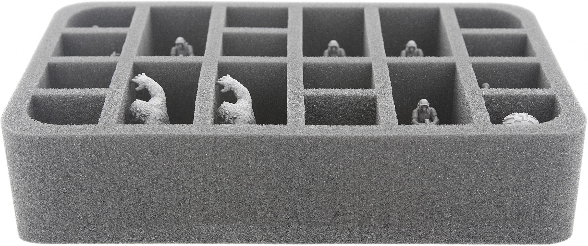 Perfecto para 12 Stormtrooper / Jedi (figuras de tamaño normal). Otras 6 ranuras para los más grandes como heros, E-Web Engineers en la plataforma o drones. Esta bandeja de espuma tiene 18 ranuras, cada una de 50 mm de profundidad. Listo para usar - base de espuma pegada de 10 mm.