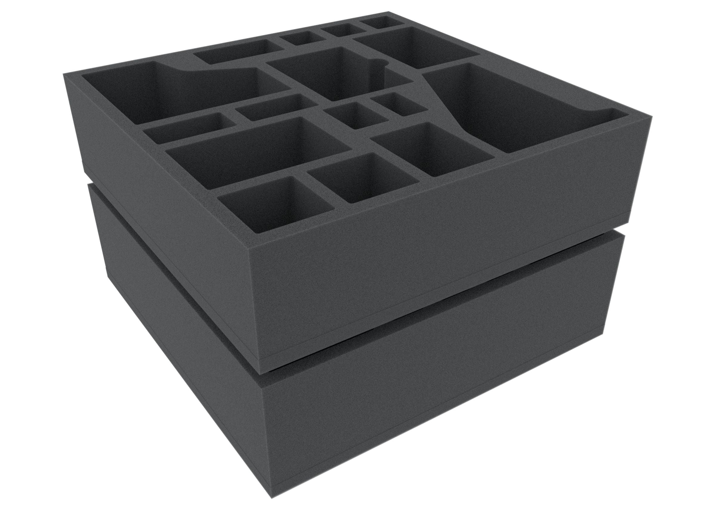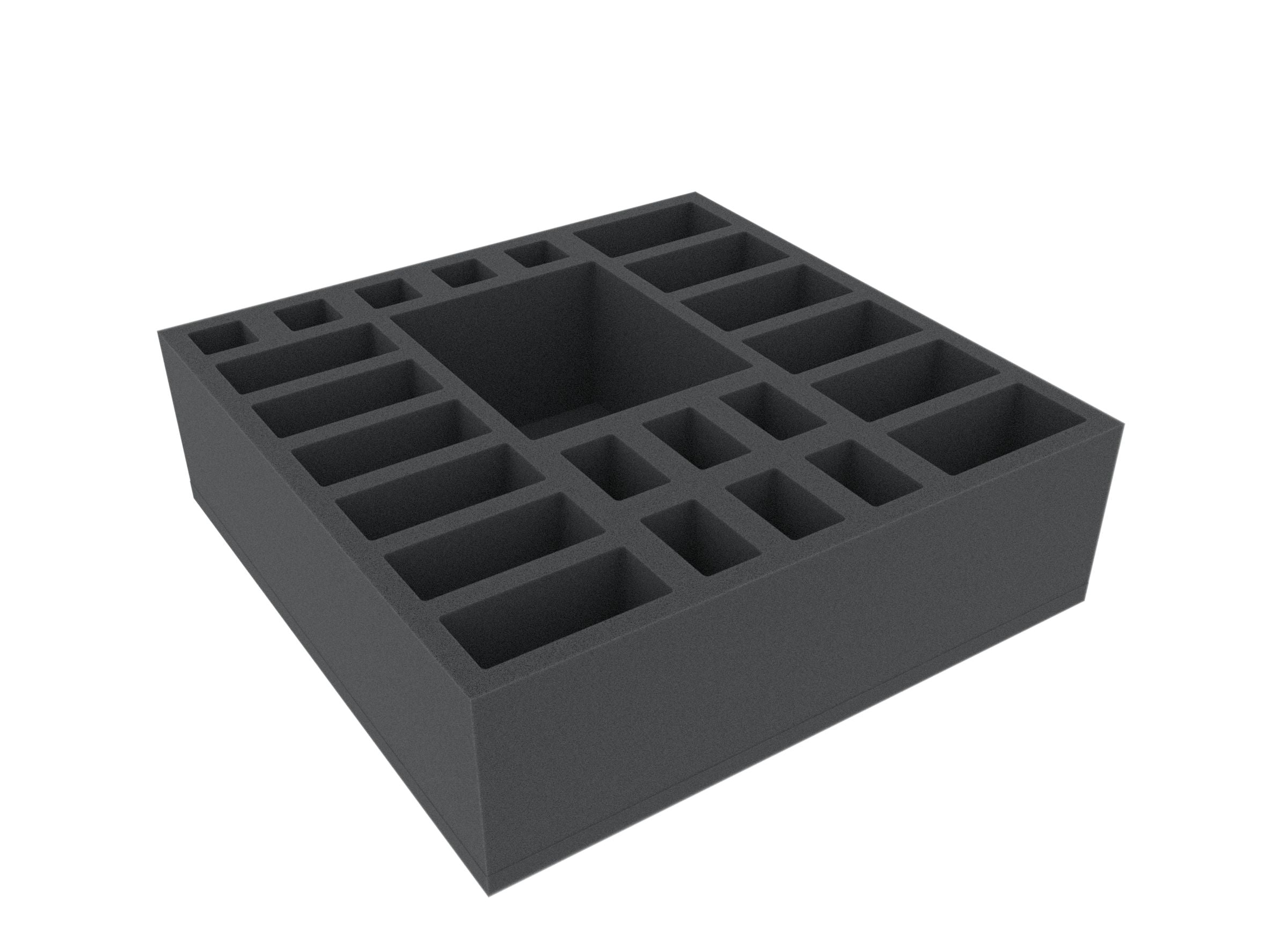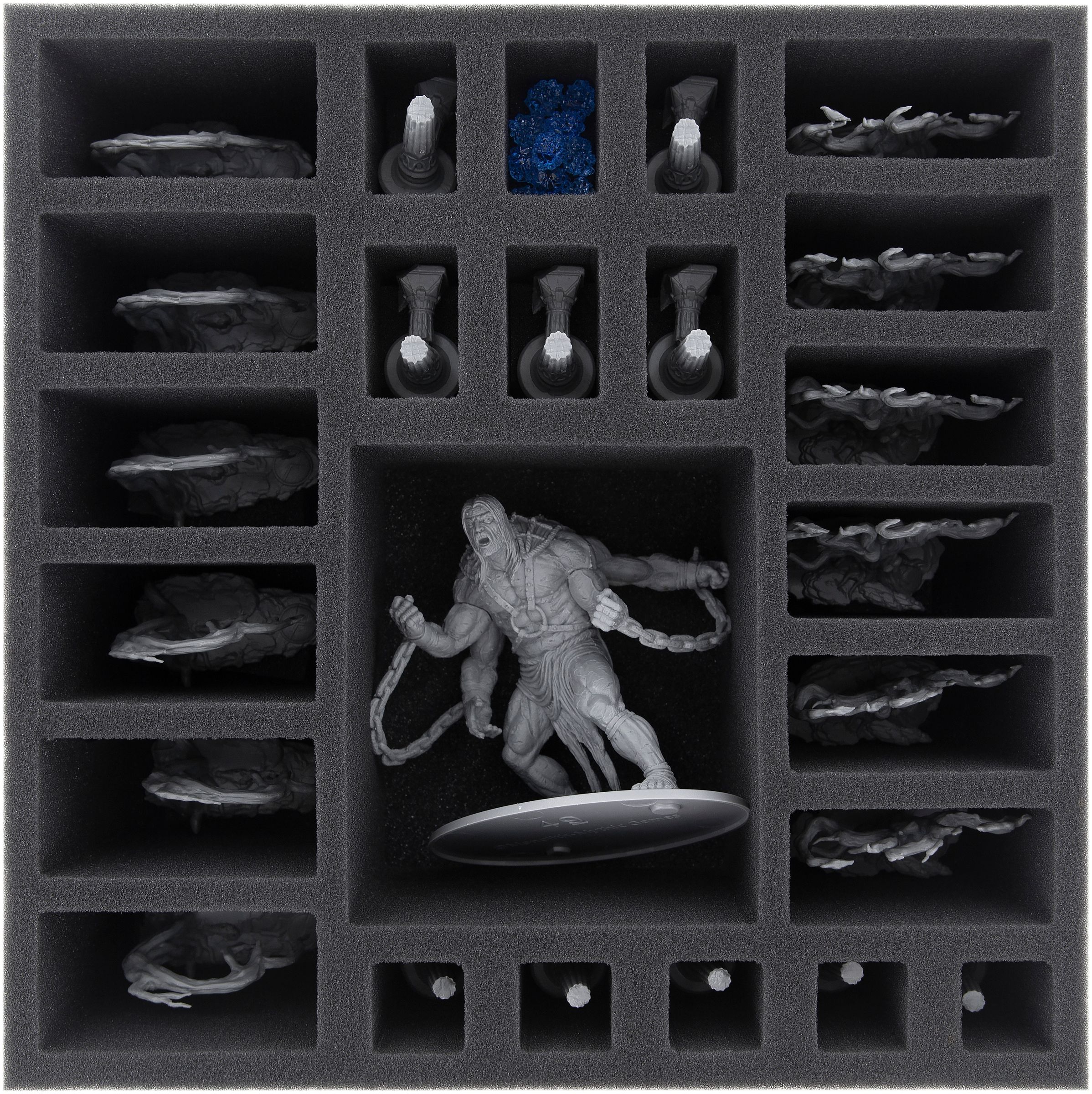 The lower foam mat consists of 24 compartments of different sizes, with a large compartment for Atlas, and smaller compartments for terrain sets.