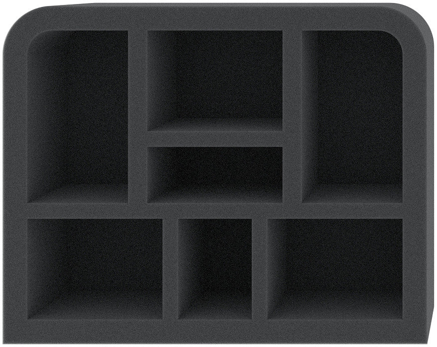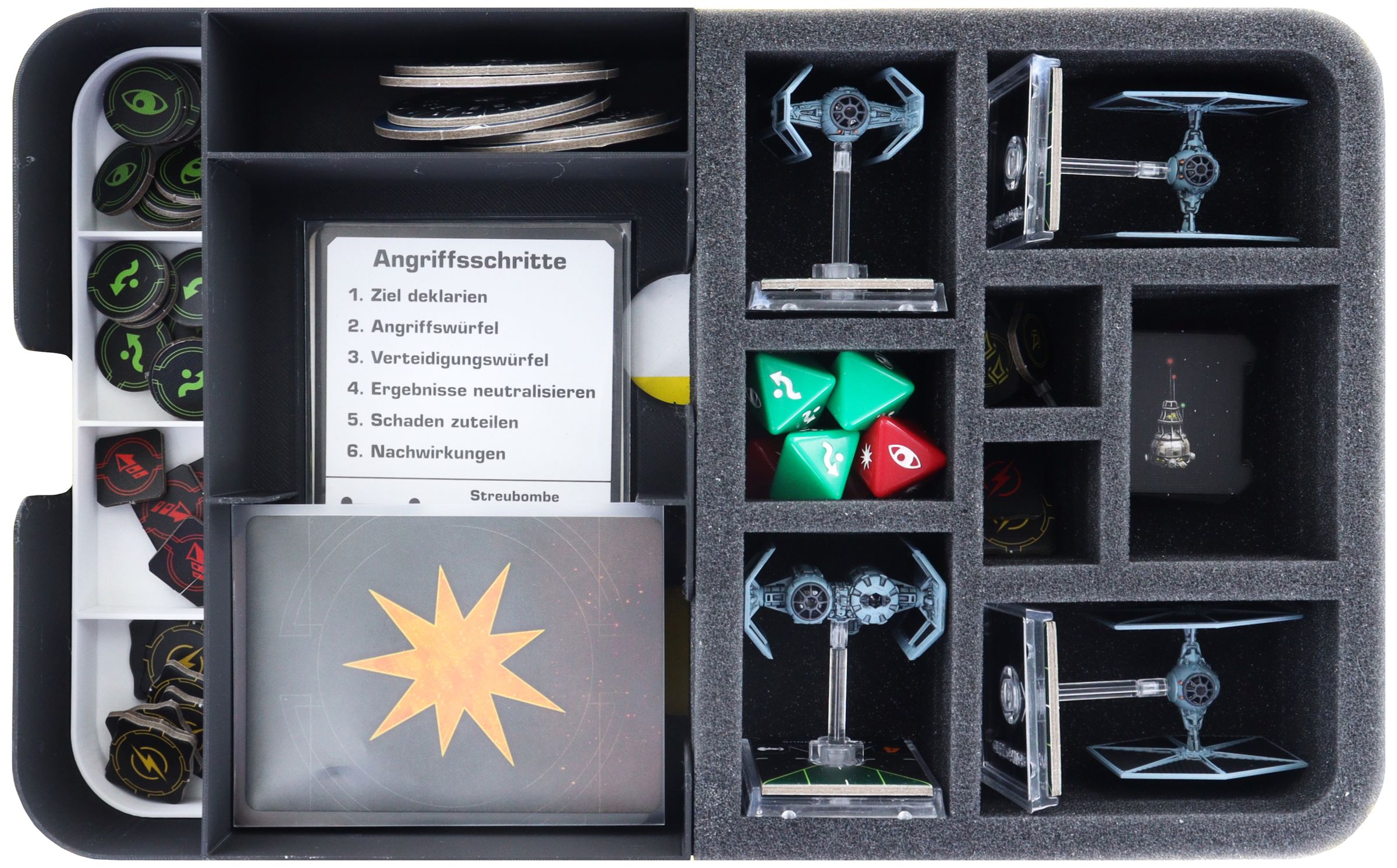 - 1 Quarter-Size foam tray with eight compartments for aircraft models like TIE Fighter, TIE Bomber, and miniatures with similar dimensions + game material (QSMFKR050BO)