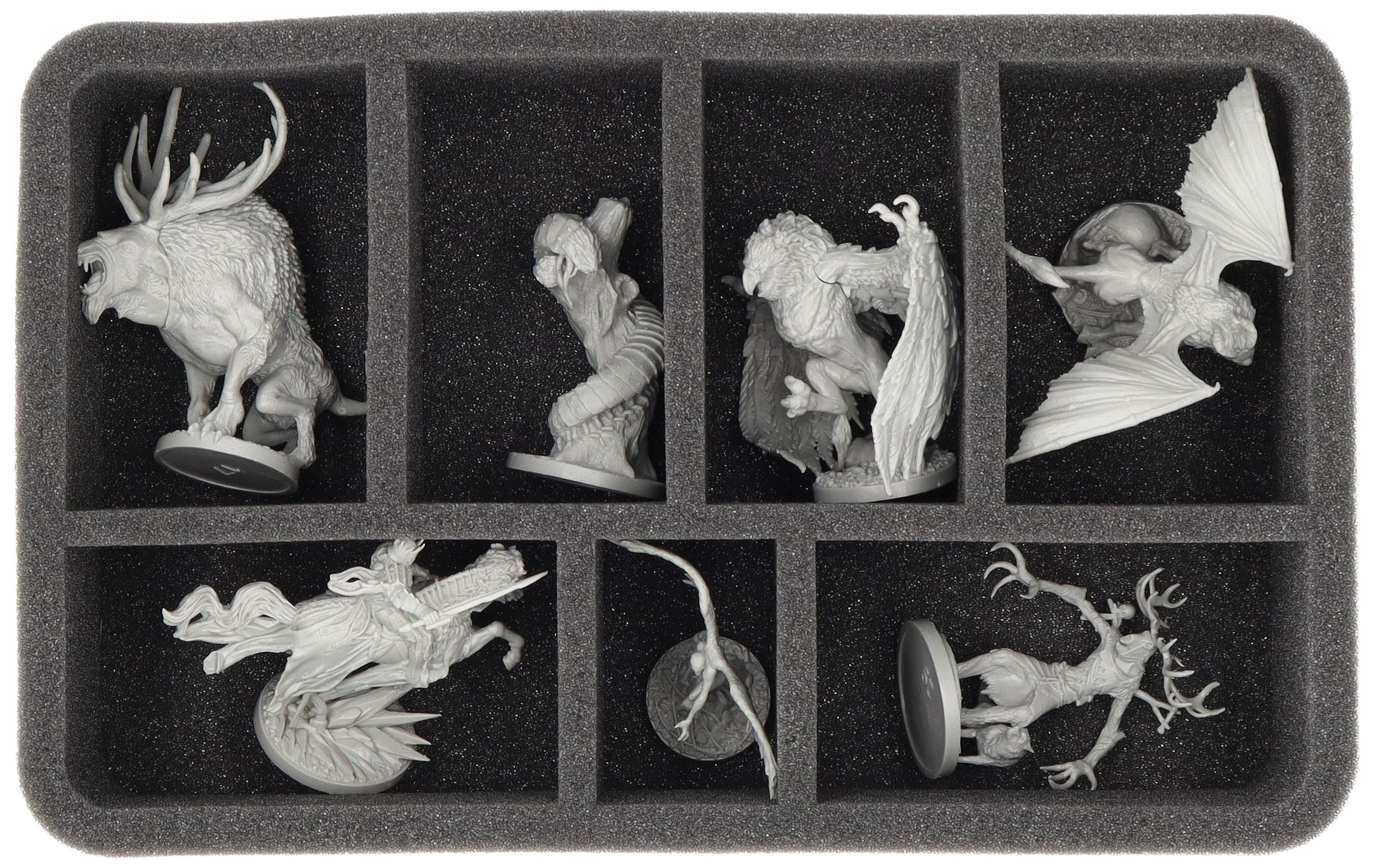 The Full-Size and Half-Size foam trays provide a safe haven for witchers and monsters – each miniature has its own custom-fit cut compartment. Embedded in soft foam, even delicate details like Bruxas claws or witchers’ swords are reliably shielded. Painted figures remain free from scratches and abrasions.