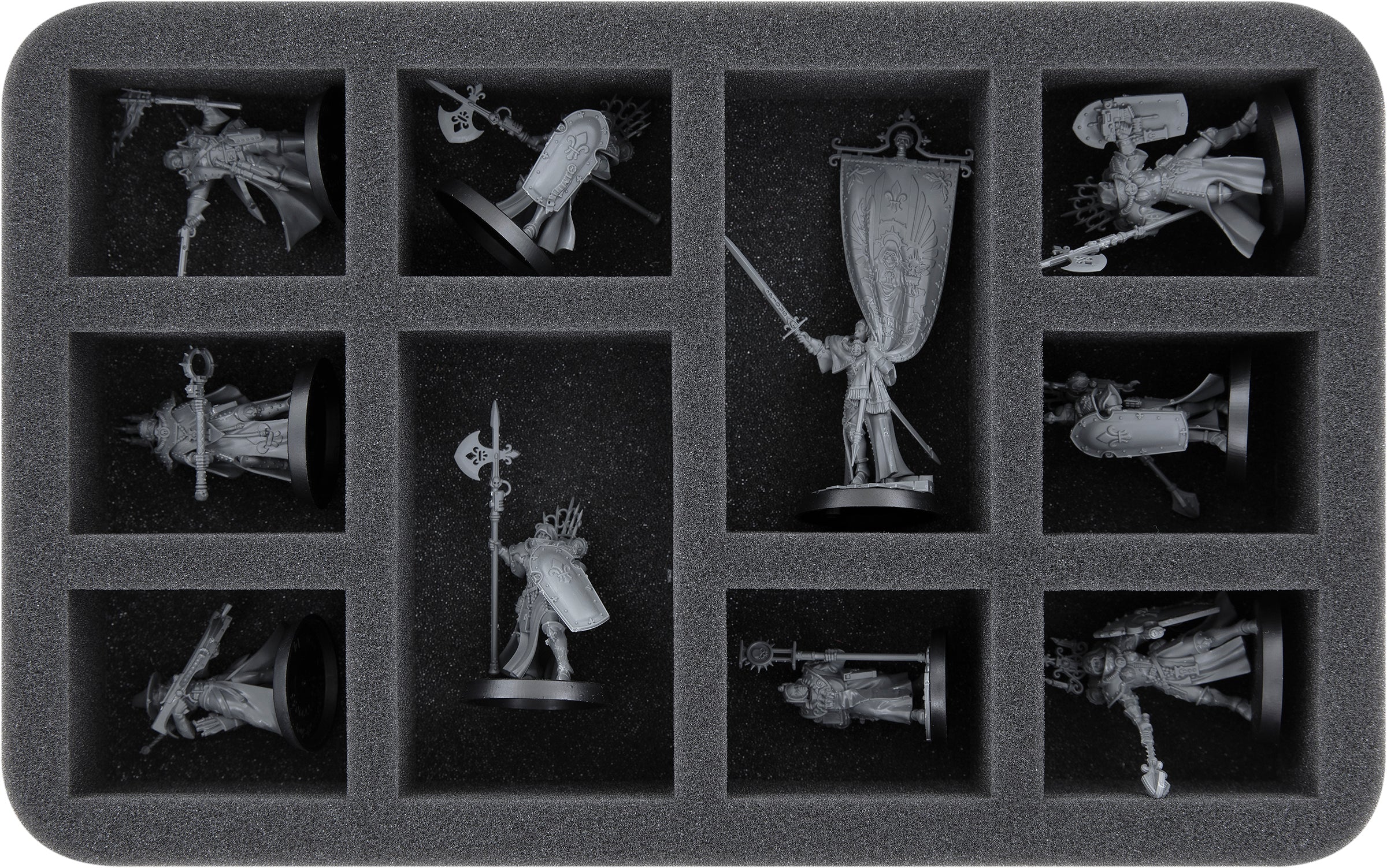 - 1 Half-Size foam tray with 10 compartments for standard models like Battle Sisters and character models like Morvenn Vahl, Abbess Sanctorum and models with similar dimensions (HS080A010)