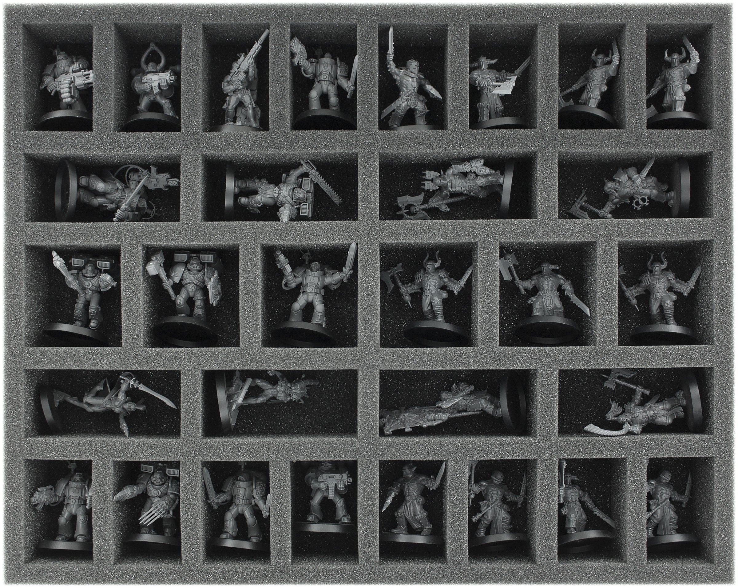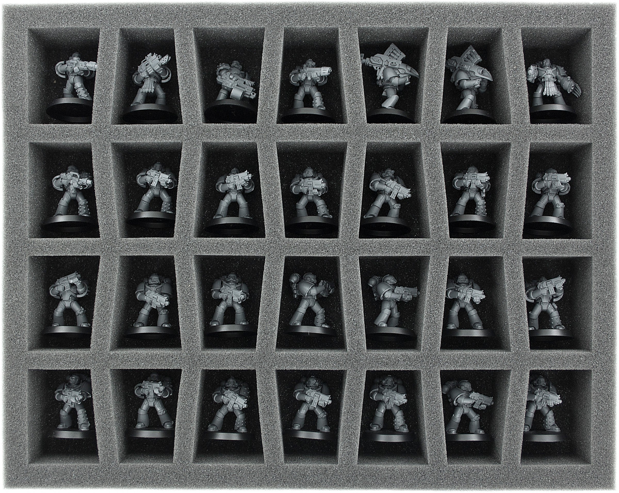 - 1 x FS050C4BO 50 mm (2 inch) Figure Foam Tray with base and 28 slots for larger tabletop models (terminators or miniatures on 40 mm base)