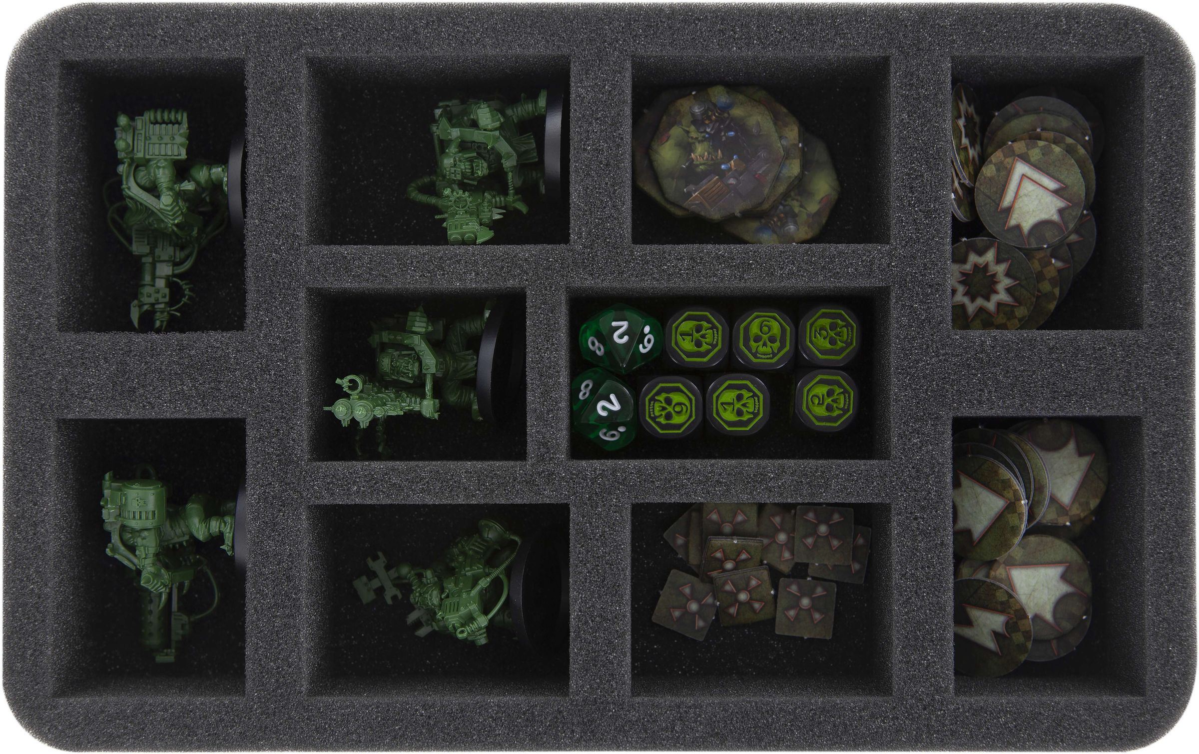 Miniature-precise cut compartments ensure that Krogskull Drakka and his Boyz, along with brenna and rokkit launcher, are spared from damage. It also prevents the figures from slipping around or colliding during transport. This preserves the colors of painted miniatures.