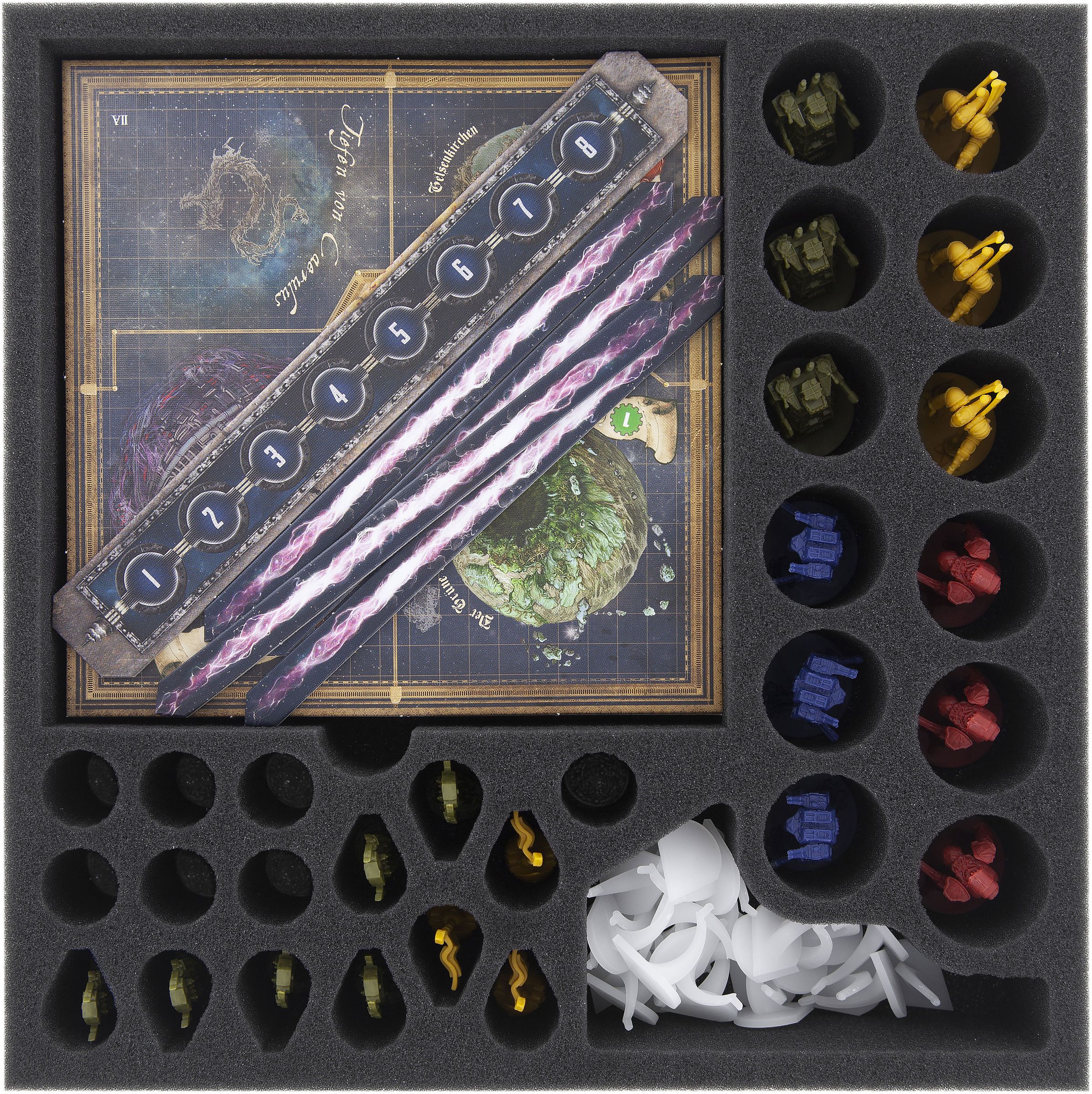 The Set consists of four custom cut, stackable foam trays. Two of these are reserved for miniatures of the four sections and various buildings. A third tray will hold the system-tiles, further miniatures and stands. The fourth tray provides space for accessories like cards, dice, tokens, you name it … Last not least, the Set comes with a foam topper to protect the components of the uppermost tray.