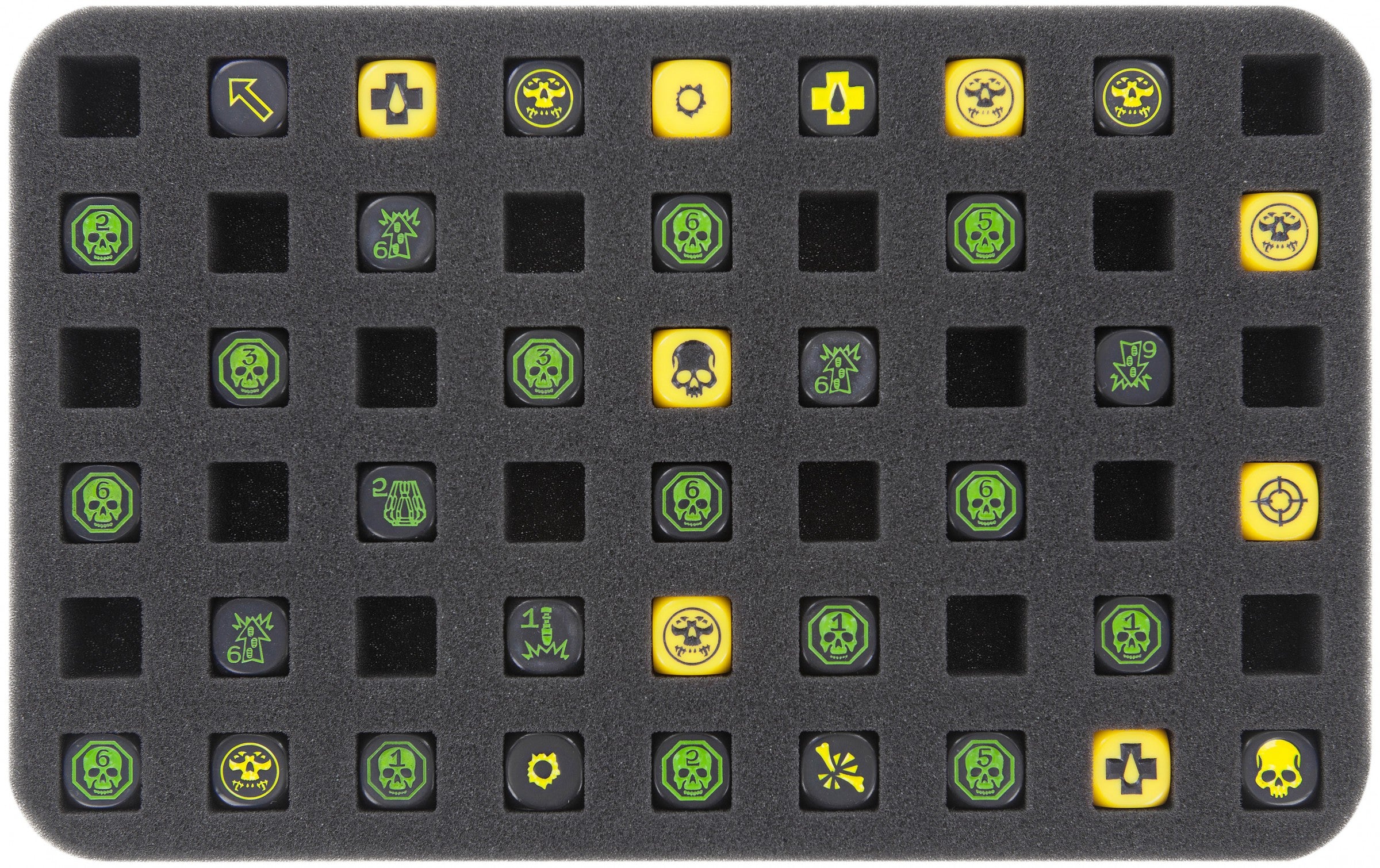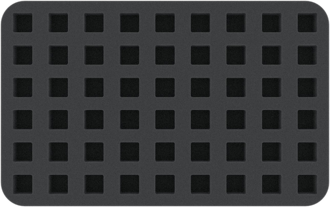 Foam tray with 54 cut-outs (16,5 mm x 16,5 mm) for Warhammer. In this foam you can stow and transport 54 Warhammer figures.
