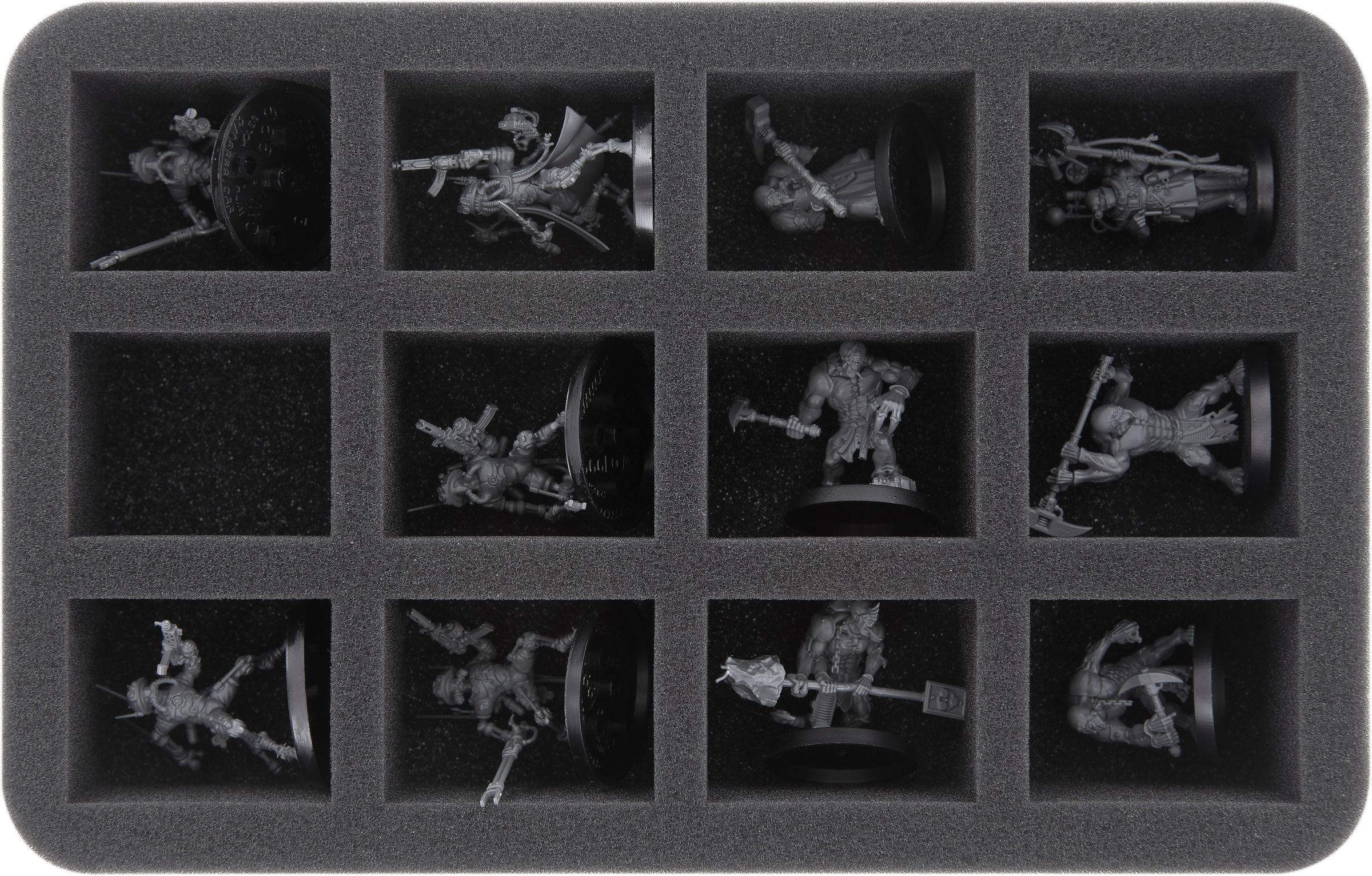 On this Half-Size foam tray you have room for up to 12 Genestealer miniatures. The twelve compartments of the same size are ideal for standard warrior models of the Genestealer Cults on bases up to 40 mm. They are particularly suitable for storing Aberrants or Neophyte Hybrids.
