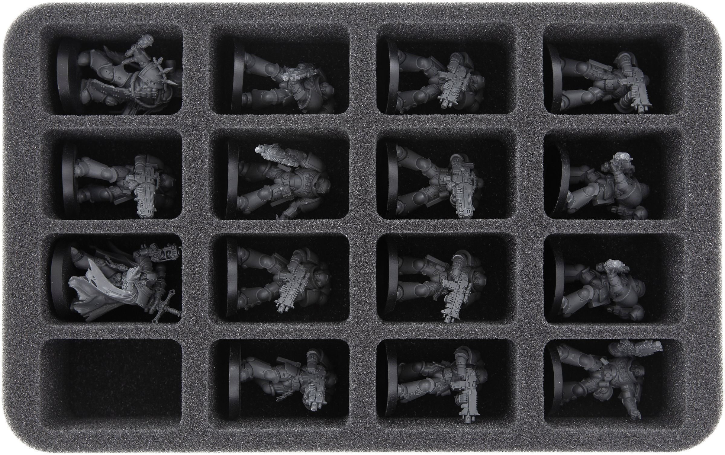 This foam tray has 16 custom-cut compartments for Warhammer 40,000 Primaris Space Marines miniatures like e.g. Intercessors or Hellblasters.