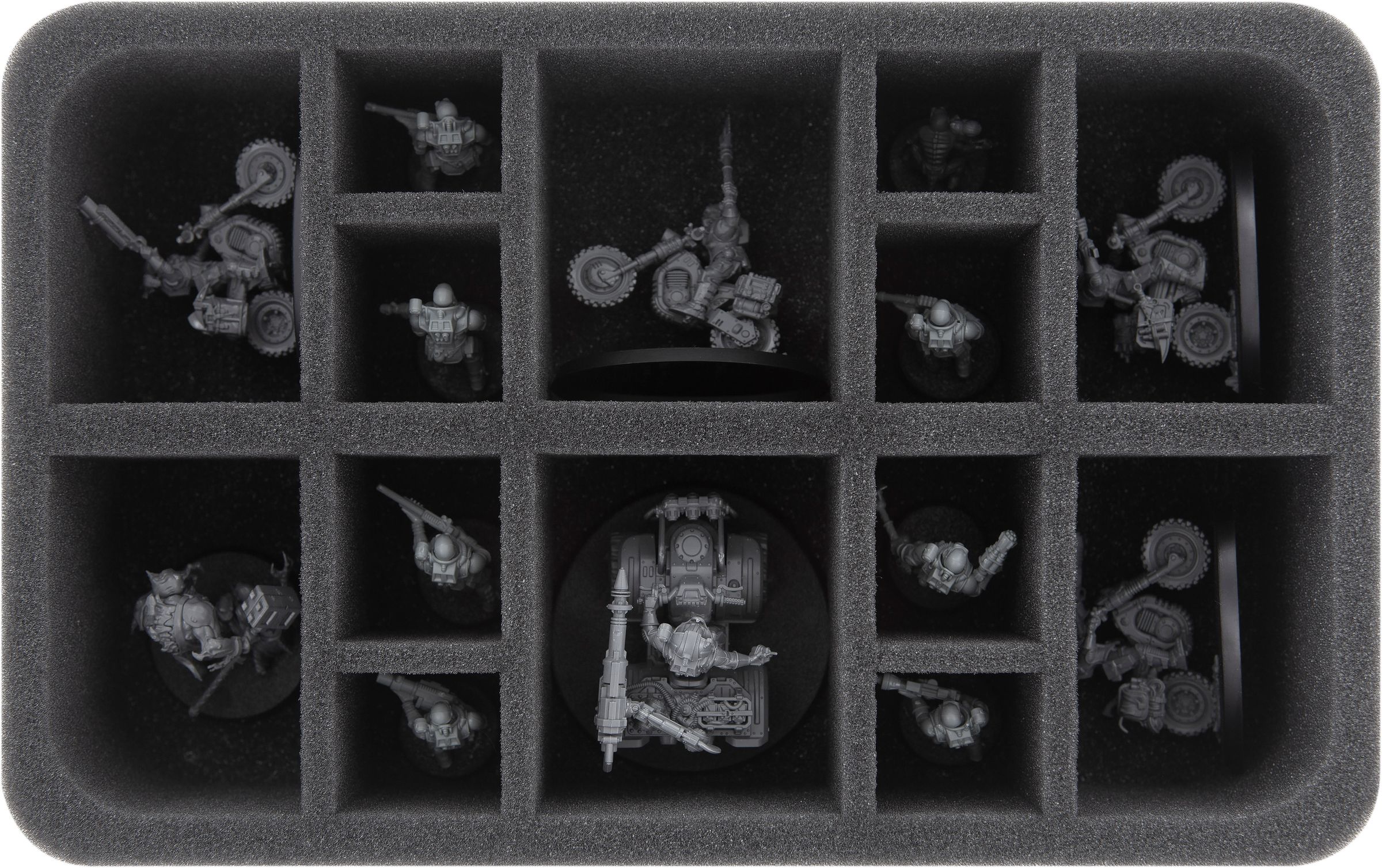 Up to 14 Genestealer warriors find a safe place in this Half-Size foam insert. The different sized compartments are suitable for standard warrior models on 25 mm base, as well as for larger Genestealer Cults miniatures.