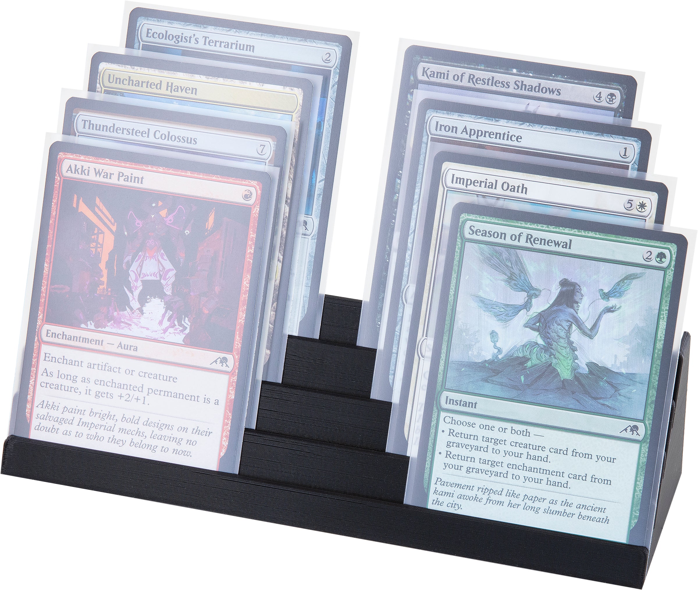 Due to the multi-leveled structure, cards standing at the back of the tray are still visible.
