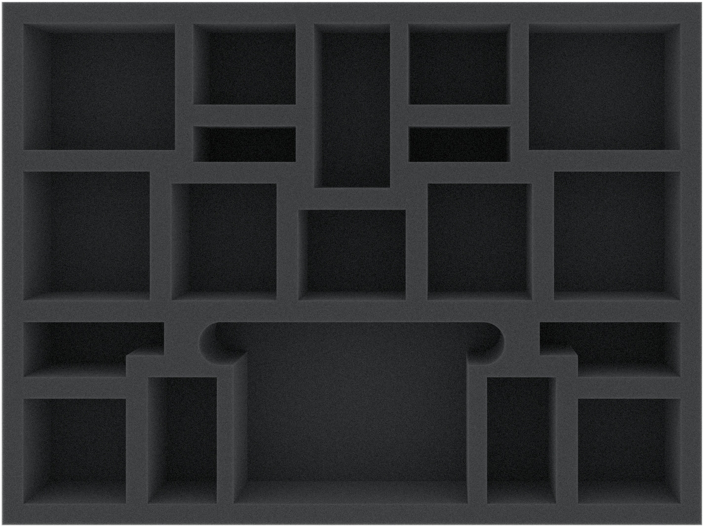 This 50 mm mm high foam tray is divided into 19 compartments. It is particularly suitable for the safe storage of tabletop and board game miniatures, as well as other fragile models and small parts.