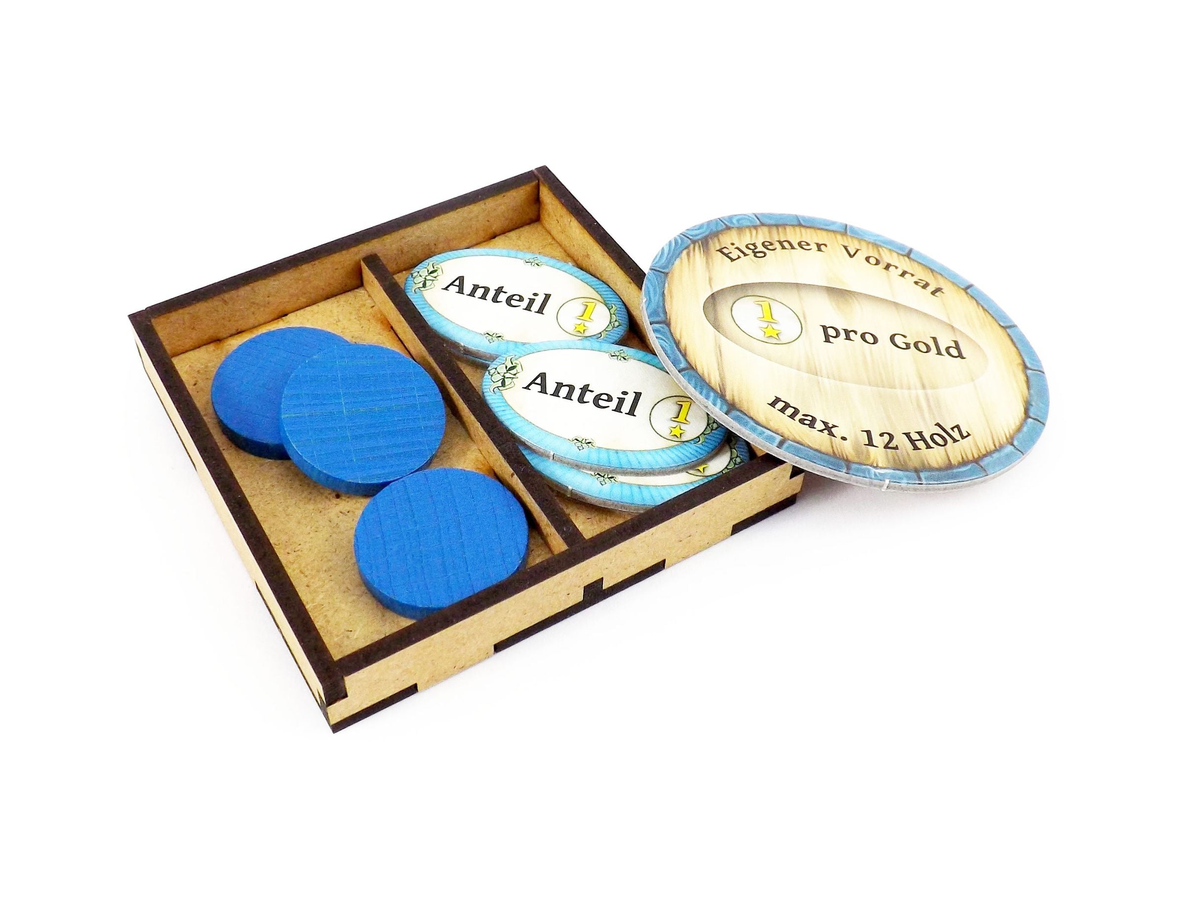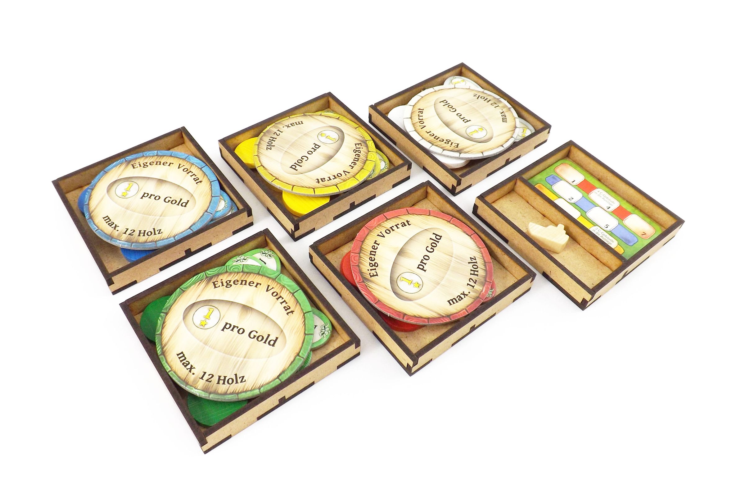 Trays 1-5: Identical trays for the five player colors. These hold the share tiles, worker disks and personal supply boards.