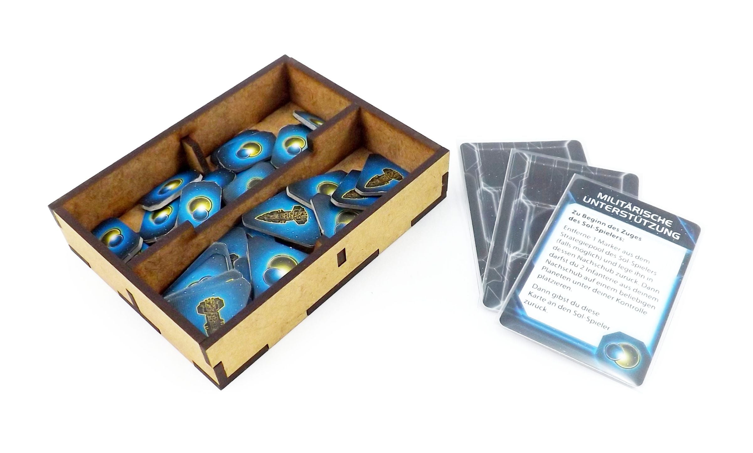 An undertaking of cosmic proportions - a race to the stars, your people colonizing new planets and your race advancing through trade, politics and military to create an everlasting star empire. In Twilight Imperium 4 the stakes are high; there are not only enough game components to set up part of the galaxy, you can also choose from 17 different factions. Hundreds of spacehip miniatures and hundreds of cards want to be neatly stored. Our organizer comes to the rescue with custom storage for all components, creating order in the vastness of space.