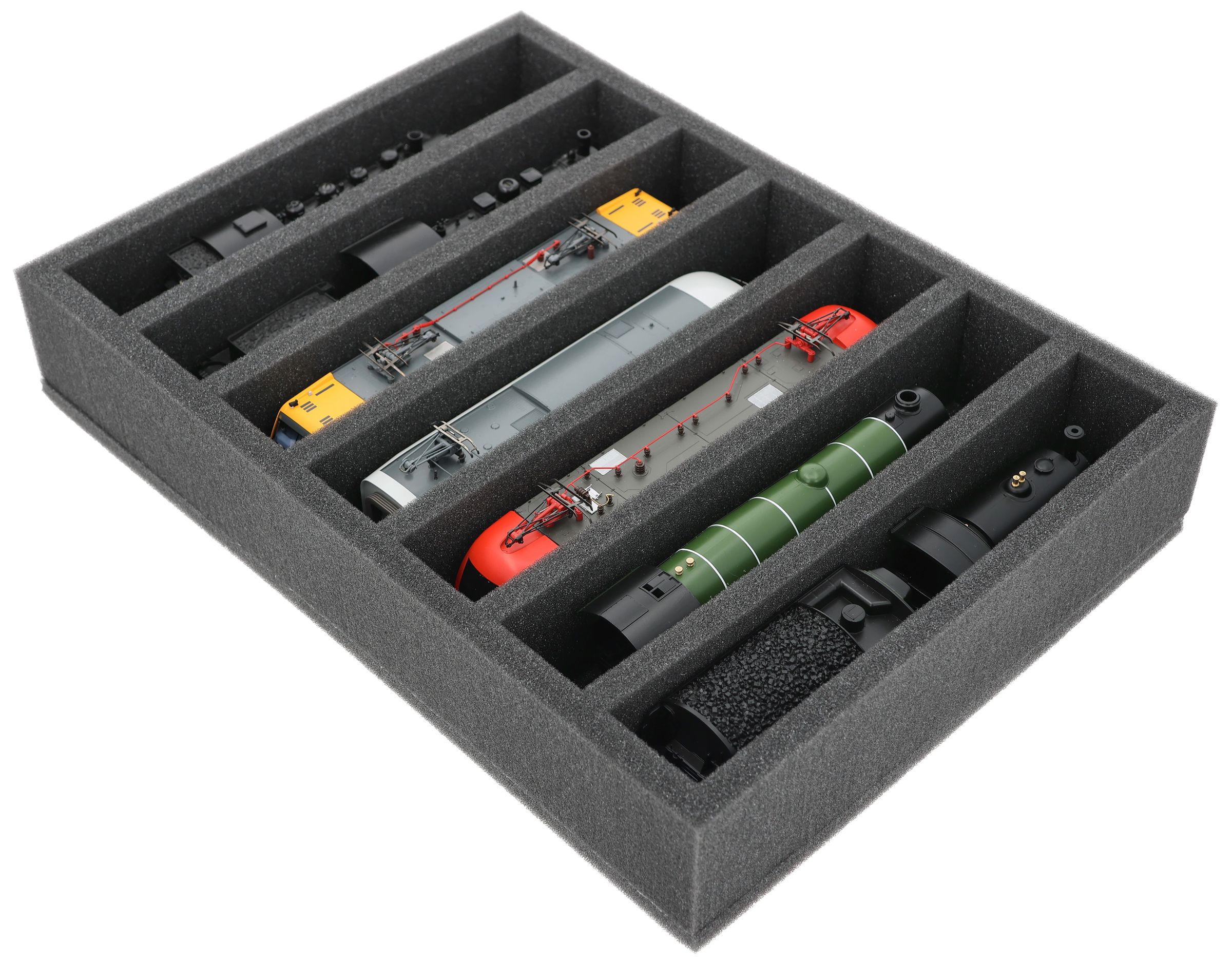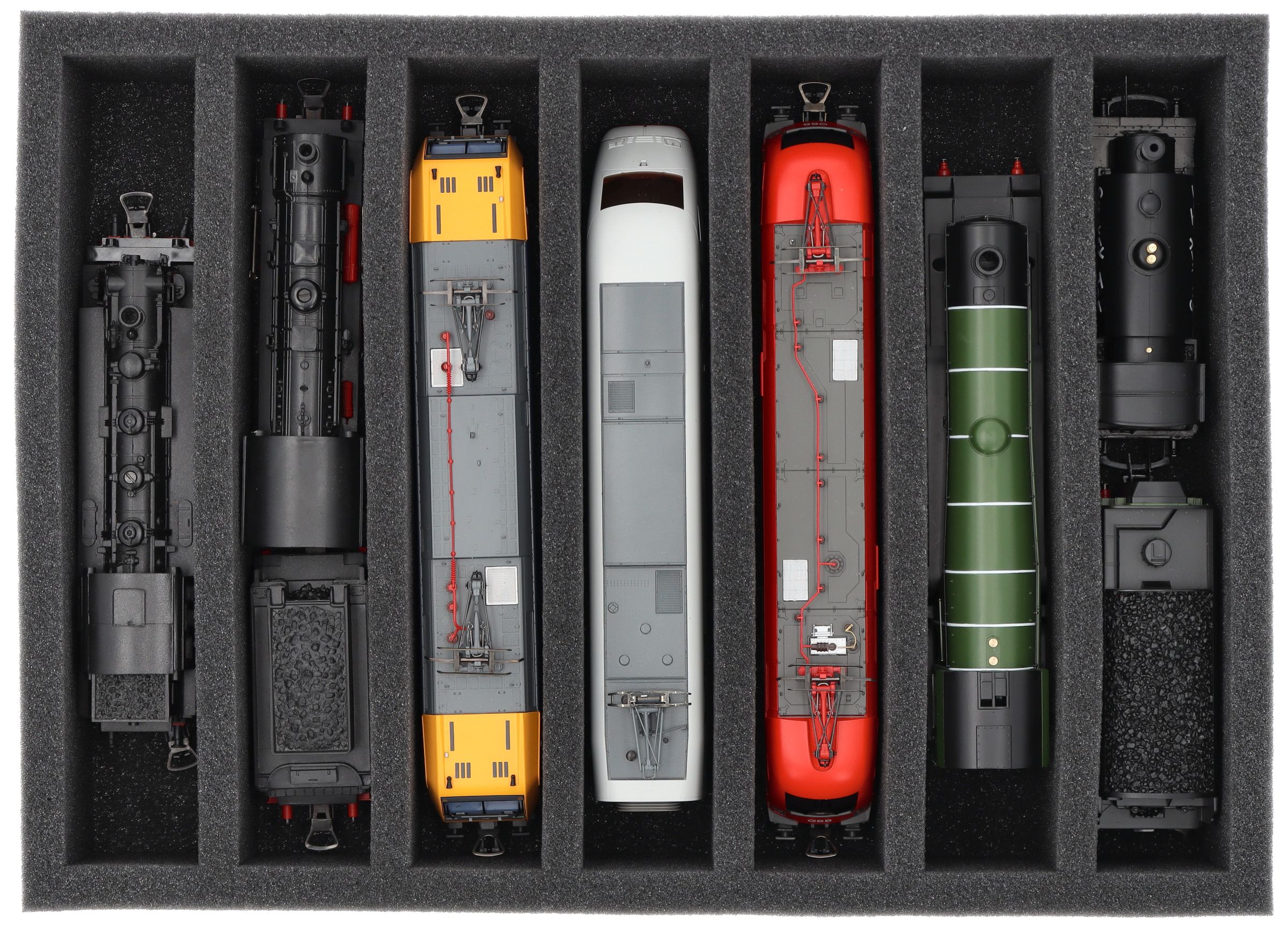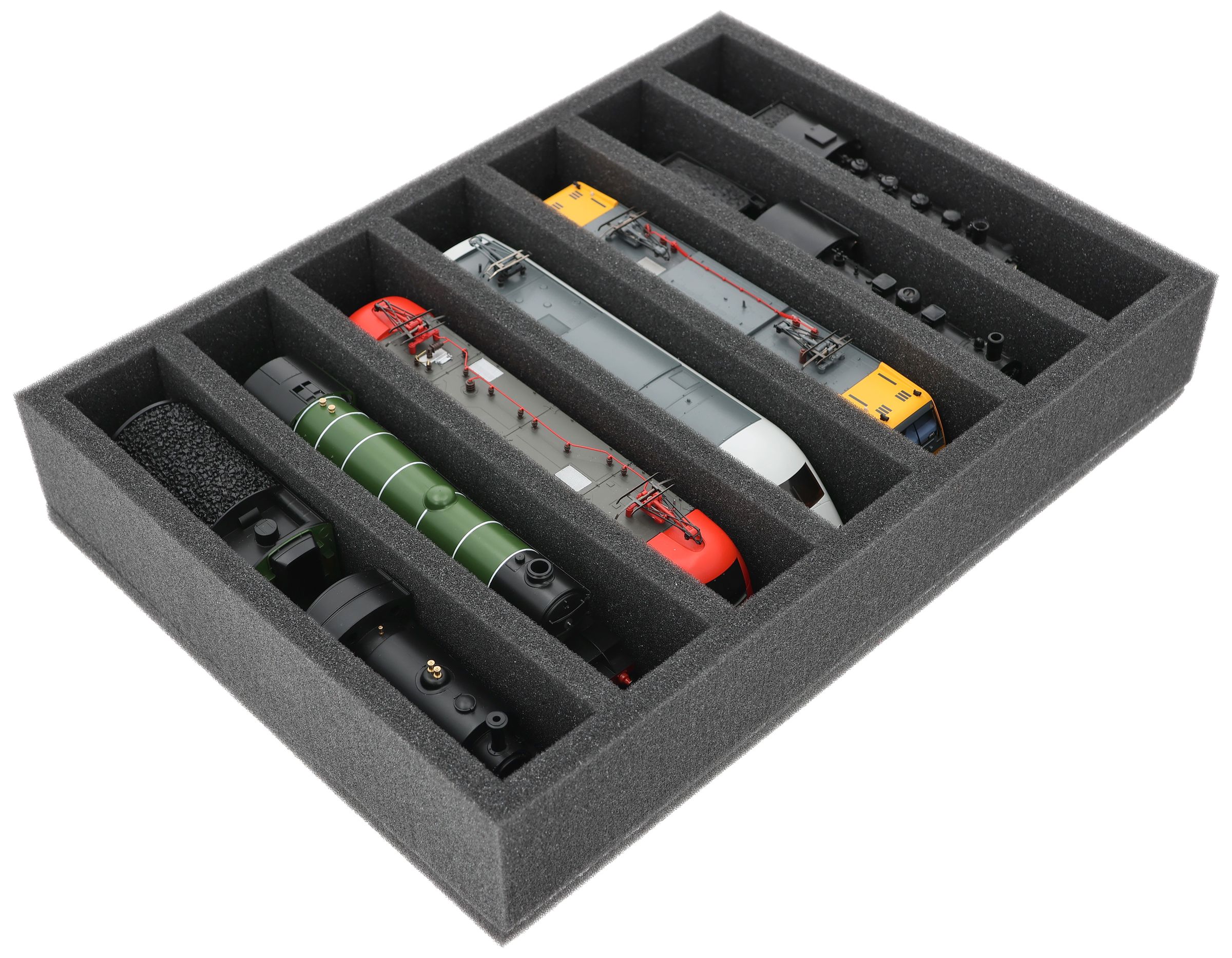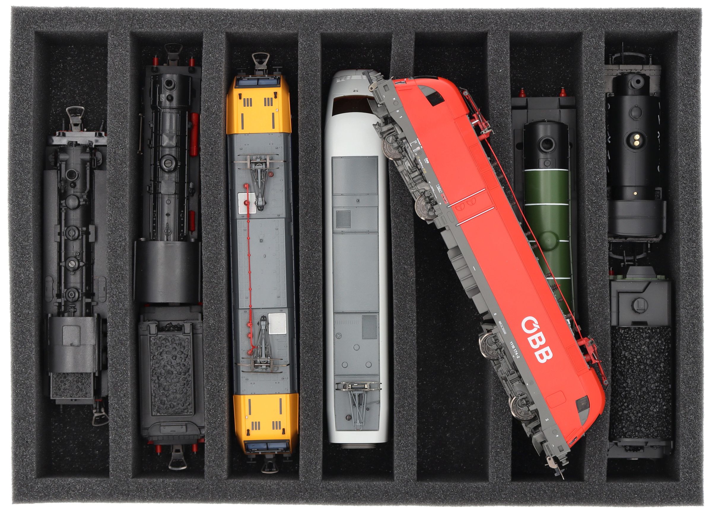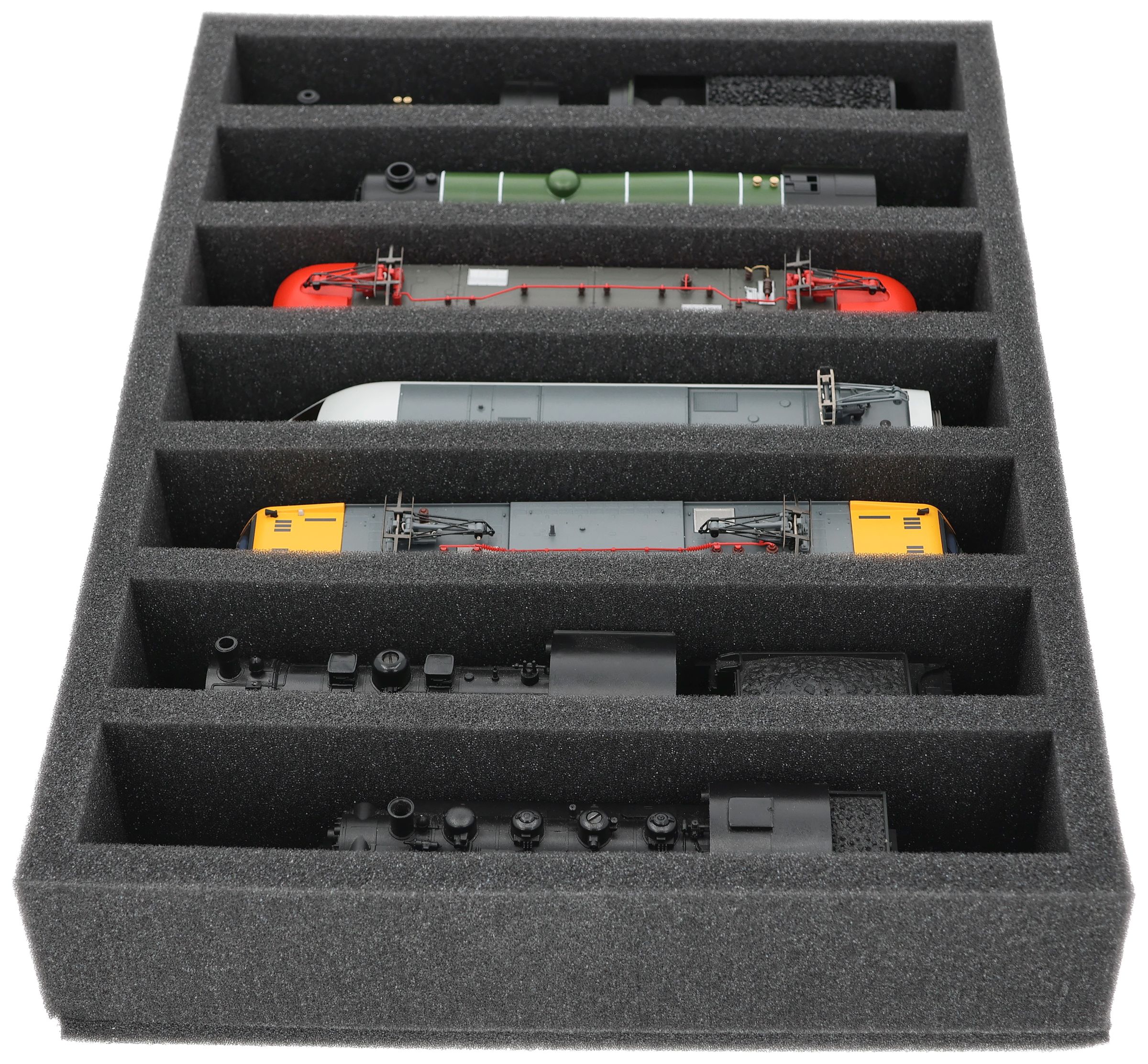 Whether for transport to exhibitions, module meetings, or safe storage on shelves at home, this insert keeps your H0 scale locomotives and cars reliably protected. The 7 compartments hold the models upright and shield them from bumps and scratches.
