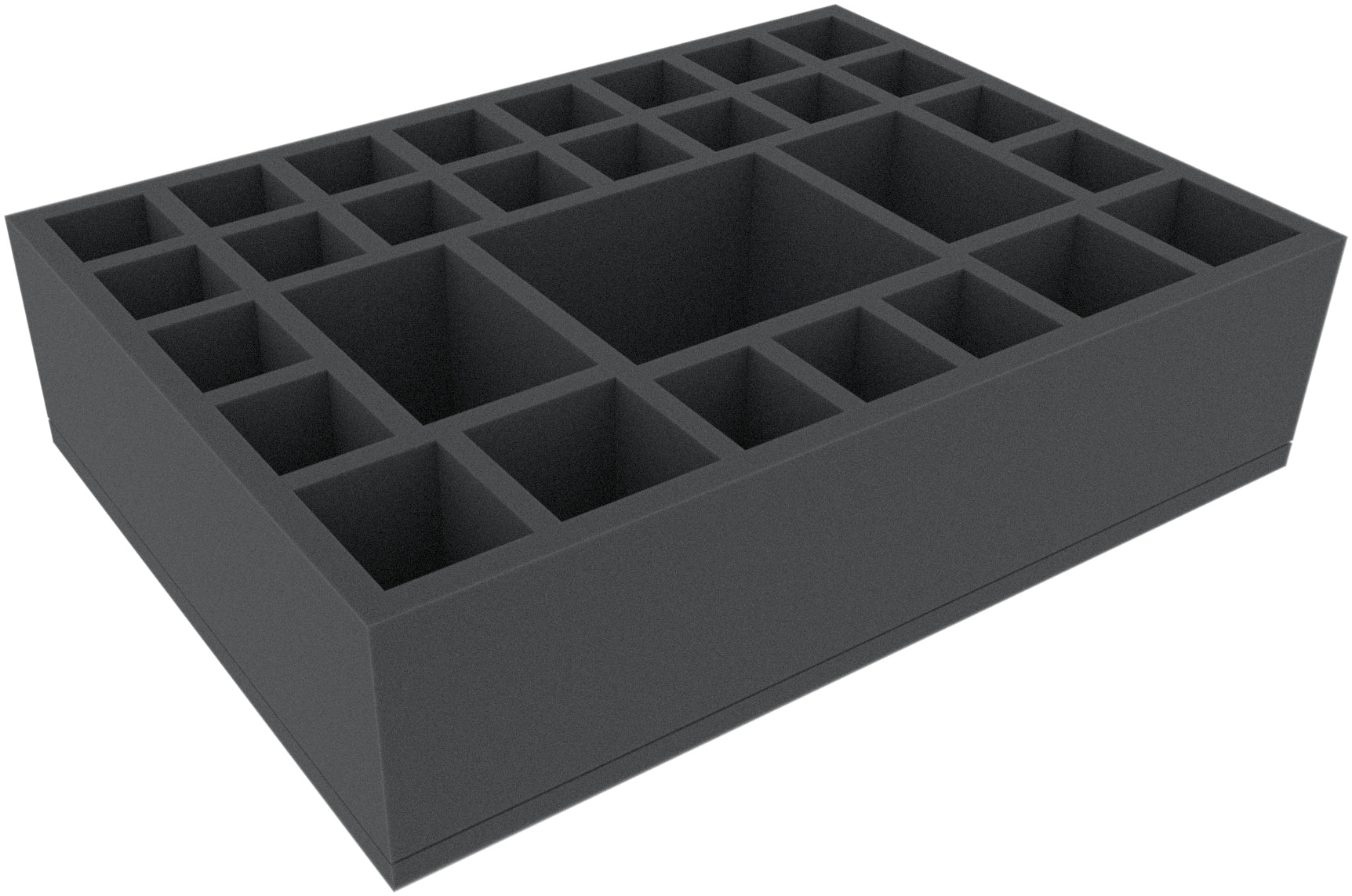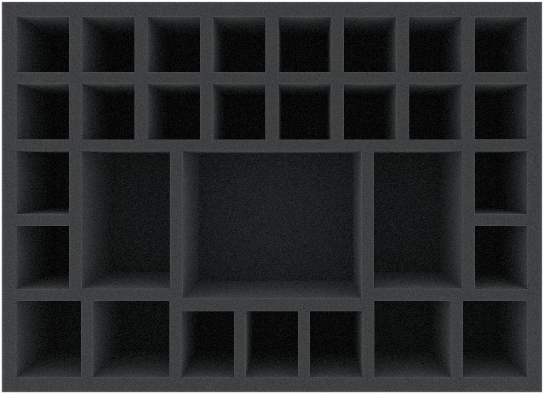 This 90 mm high Feldherr foam insert offers you 30 custom-fit compartments for the safe storage and transport of miniatures from various board game and tabletop systems. Your models remain neatly sorted and reliably protected.