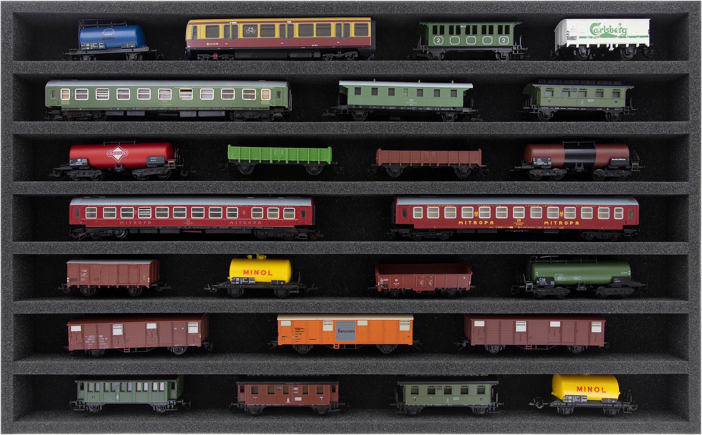 Seven compartments, tailor-made for horizontal storage of model railways in Gauge TT, offer your wagons and locomotives reliable protection for storage and transport. Due to the lying position the tray can also be used as a display for the presentation of your model train collection.