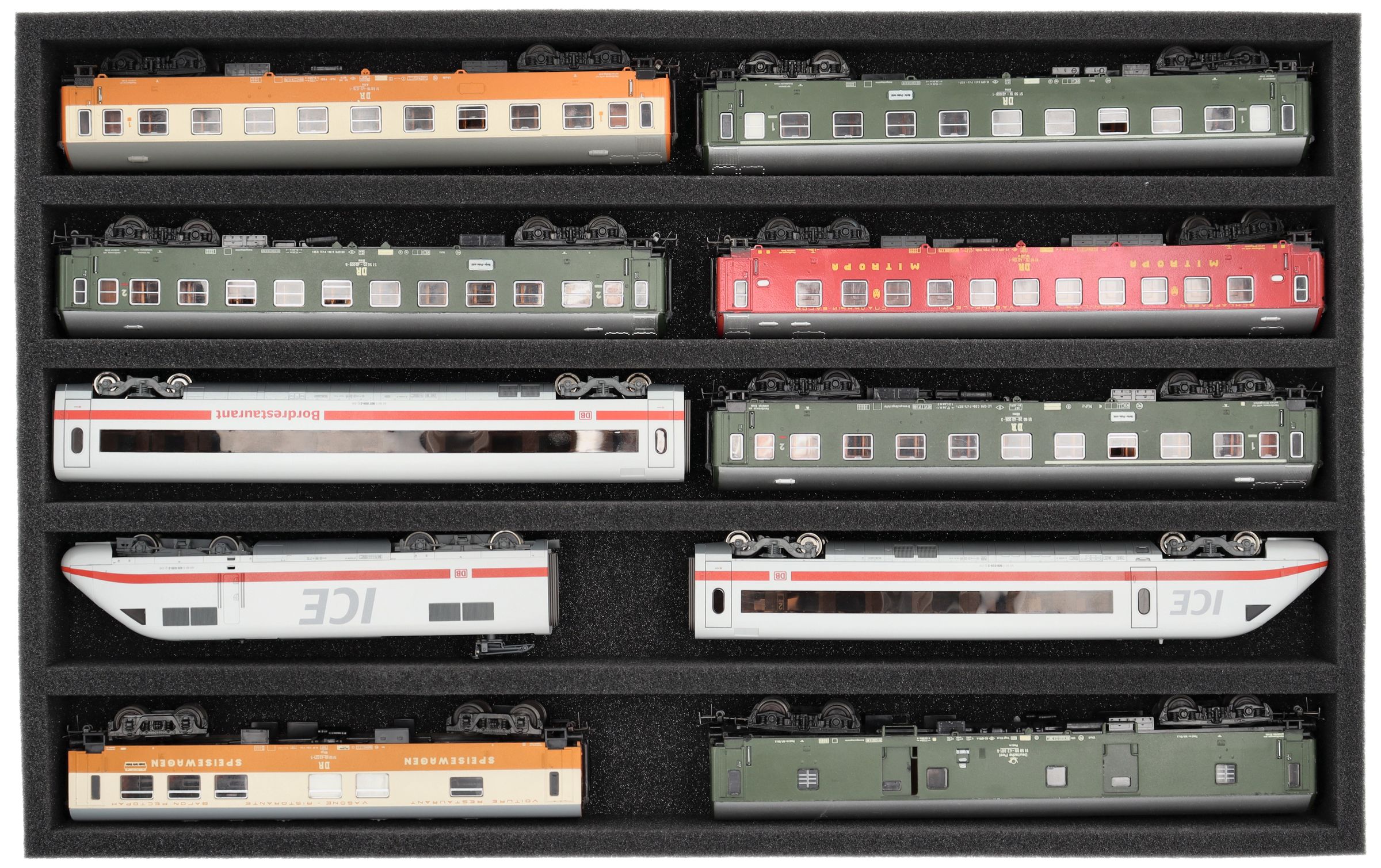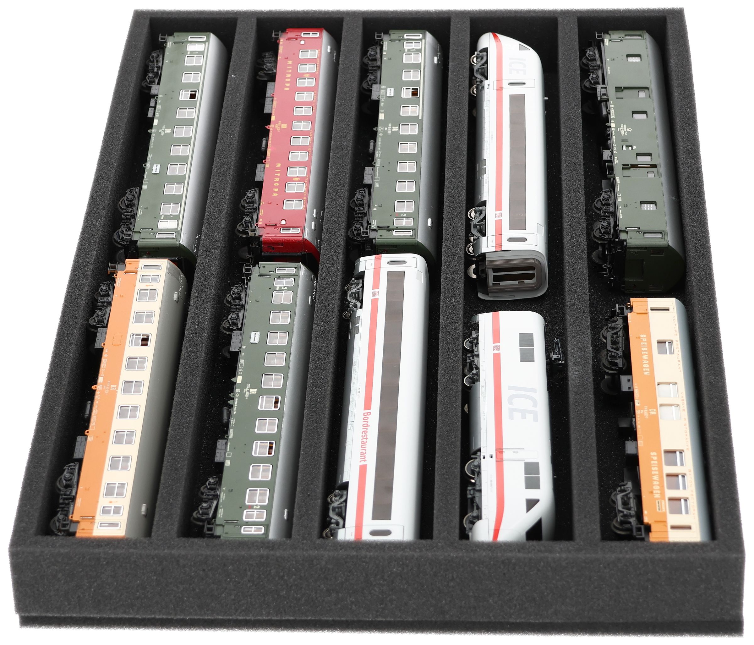 Five compartments, tailor-made for horizontal storage of model railways in Gauge H0, offer your wagons and locomotives reliable protection for storage and transport. Due to the lying position the tray can also be used as a display for the presentation of your model train collection.
