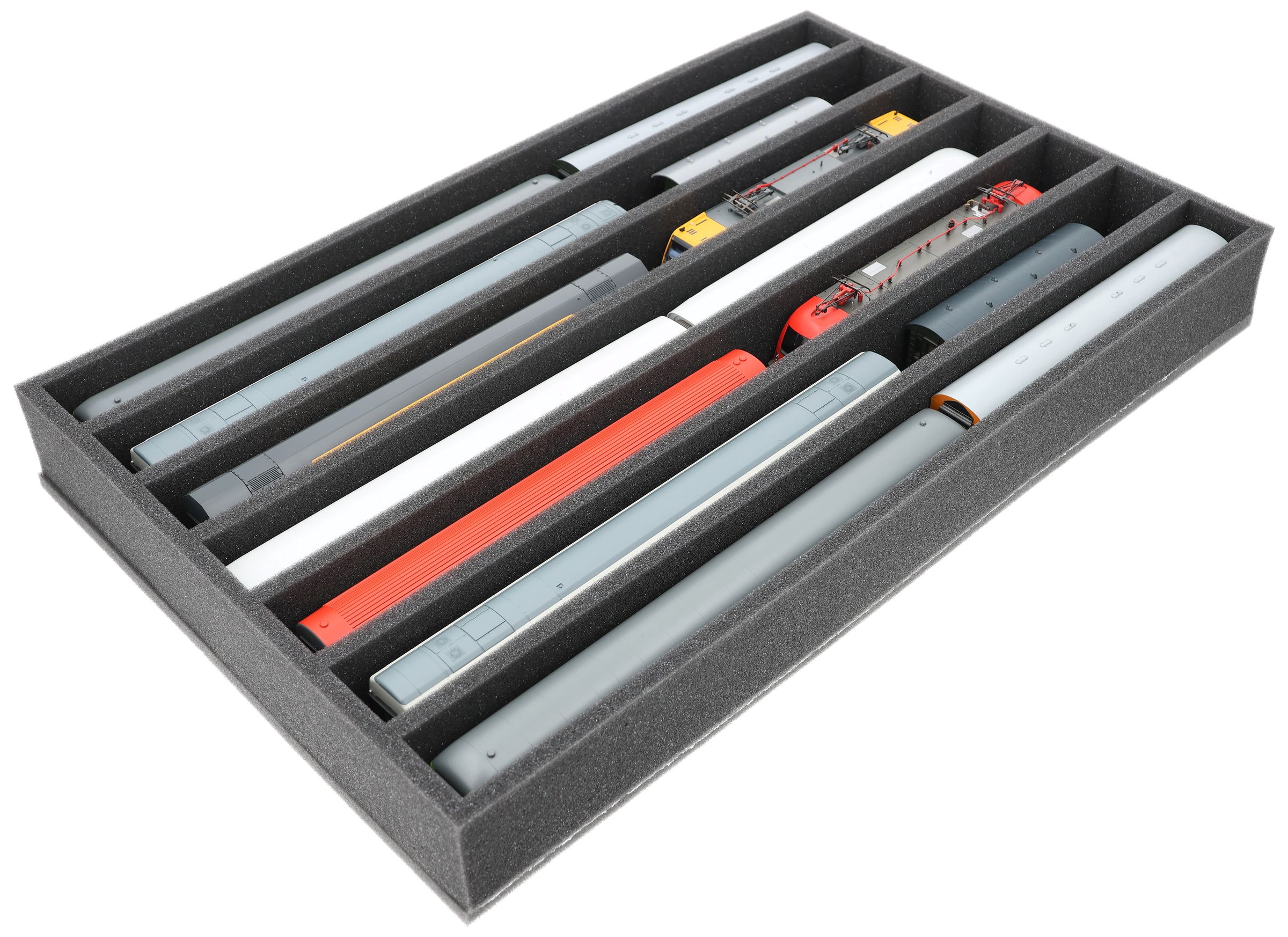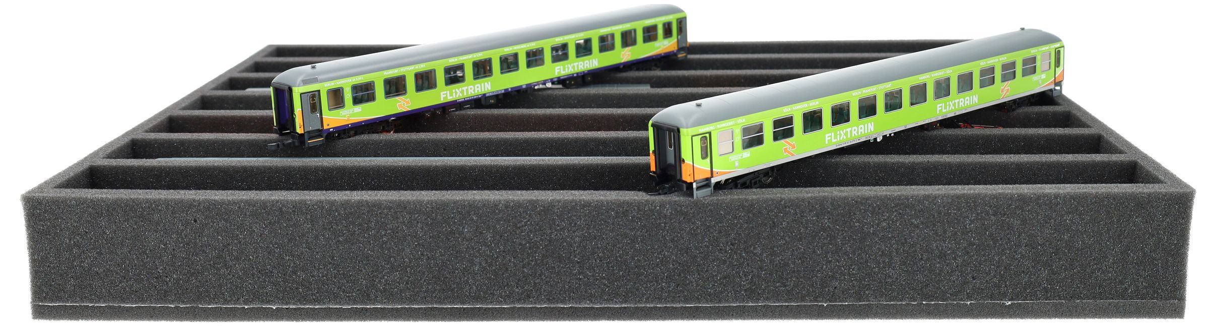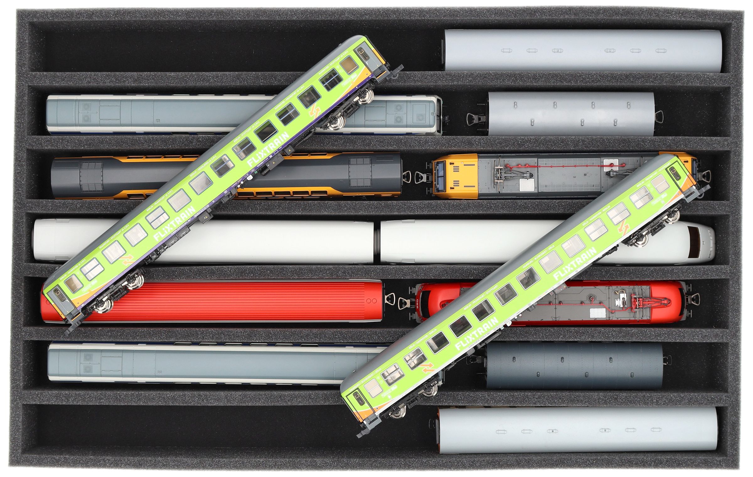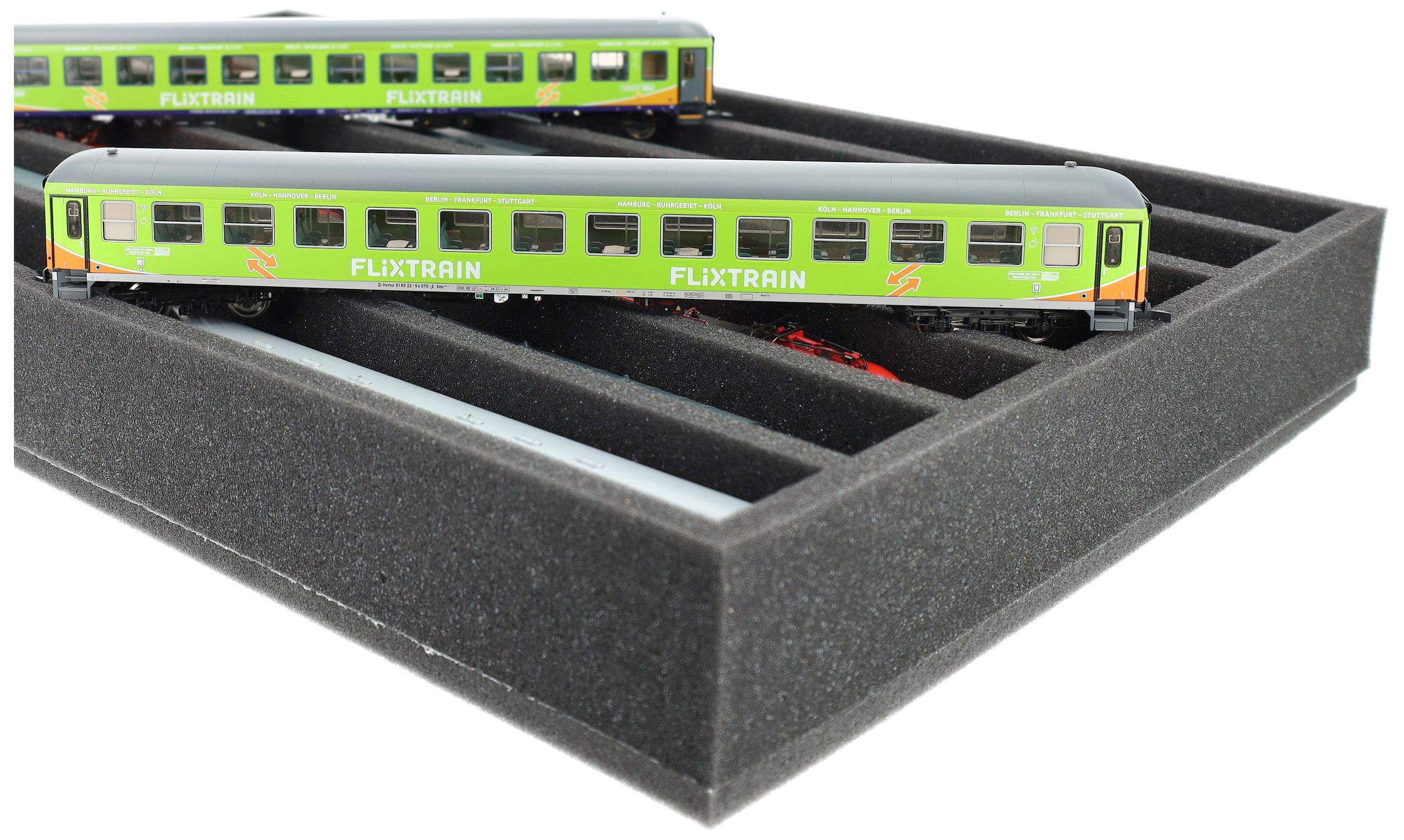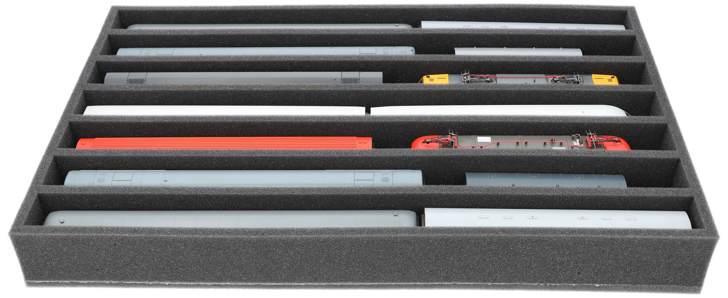 Several trains and carriages can be stored next to each other in one compartment. In order to prevent collision or unintentional coupling, we offer suitable foam spacers (HS040A002, HS020A001) to separate your model trains.