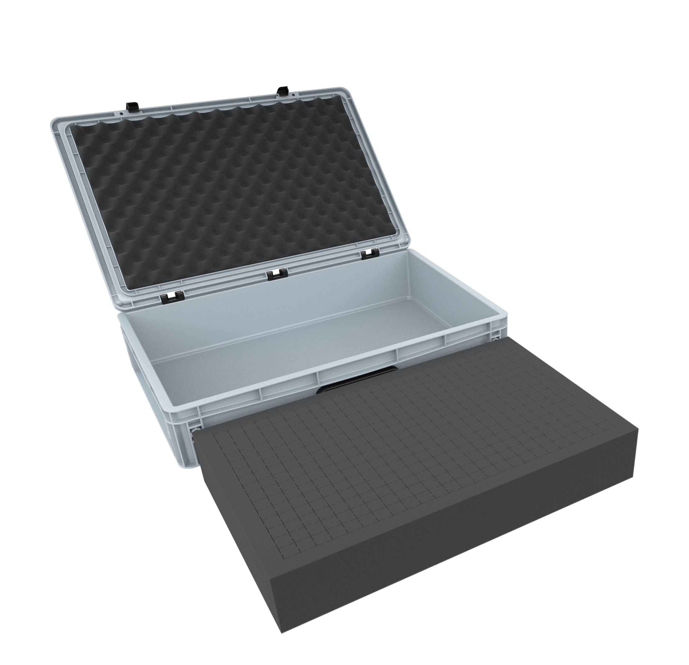 Set of Eurobox 600 mm x 400 mm x 135 mm filled with 1 Pick and Pluck foam insert. The grid of the foam allows an individual adaptation of the foam inserts to all shapes. It is ideally suited as protection for the transport of various industrial products such as medical equipment, tool components or technical equipment. The pick and pluck foam is perforated with a grid of 20 mm x 20 mm x height of the insert (90 mm) and a circumferential edge of 25 mm. As a bottom we use a 10 mm thick base (DS010B), which makes it possible to transport even heavy products. The nap foam serves as top cover and is cut exactly to fit the lid of Auer's Eurobox. Since it is equipped with a self-adhesive foil, you do not need any further tools. All you have to do is remove the adhesive foil from the foam insert and glue the self-adhesive side into the hinged top of the Eurobox. The entire set can therefore be designed, adapted and used according to your personal needs without special tools.