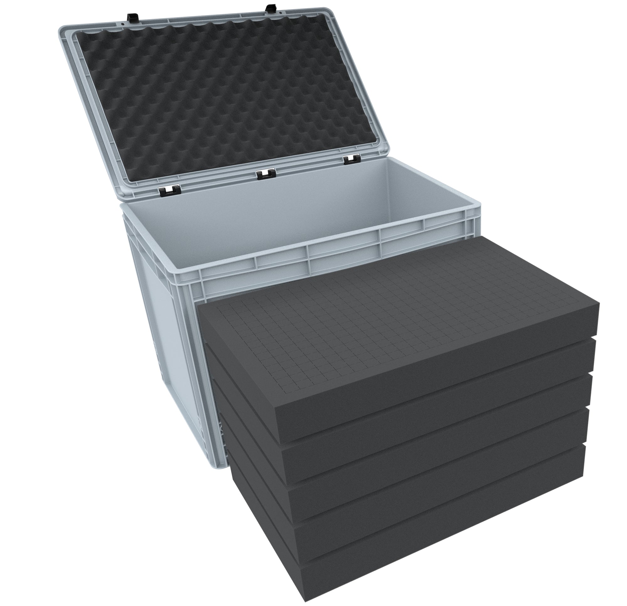 Set of Eurobox 600 mm x 400 mm x 435 mm filled with 6 Pick and Pluck foam insert. The grid of the foam allows an individual adaptation of the foam inserts to all shapes. It is ideally suited as protection for the transport of various industrial products such as medical equipment, tool components or technical equipment. The pick and pluck foam is perforated with a grid of 20 mm x 20 mm x height of the insert (60 mm / 70 mm) and a circumferential edge of 25 mm. As a bottom we use a 20 mm thick base (DS020B), which makes it possible to transport even heavy products. The nap foam serves as top cover and is cut exactly to fit the lid of Auer's Eurobox. Since it is equipped with a self-adhesive foil, you do not need any further tools. All you have to do is remove the adhesive foil from the foam insert and glue the self-adhesive side into the hinged top of the Eurobox. The entire set can therefore be designed, adapted and used according to your personal needs without special tools.