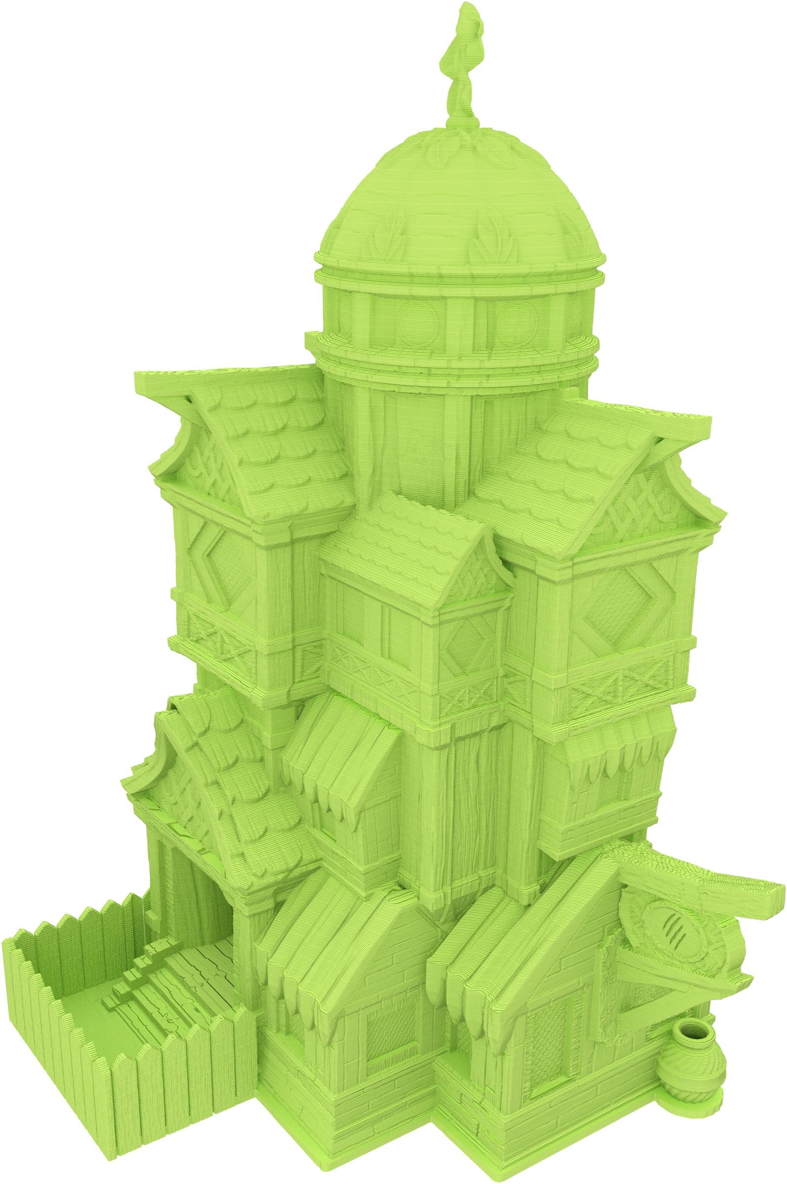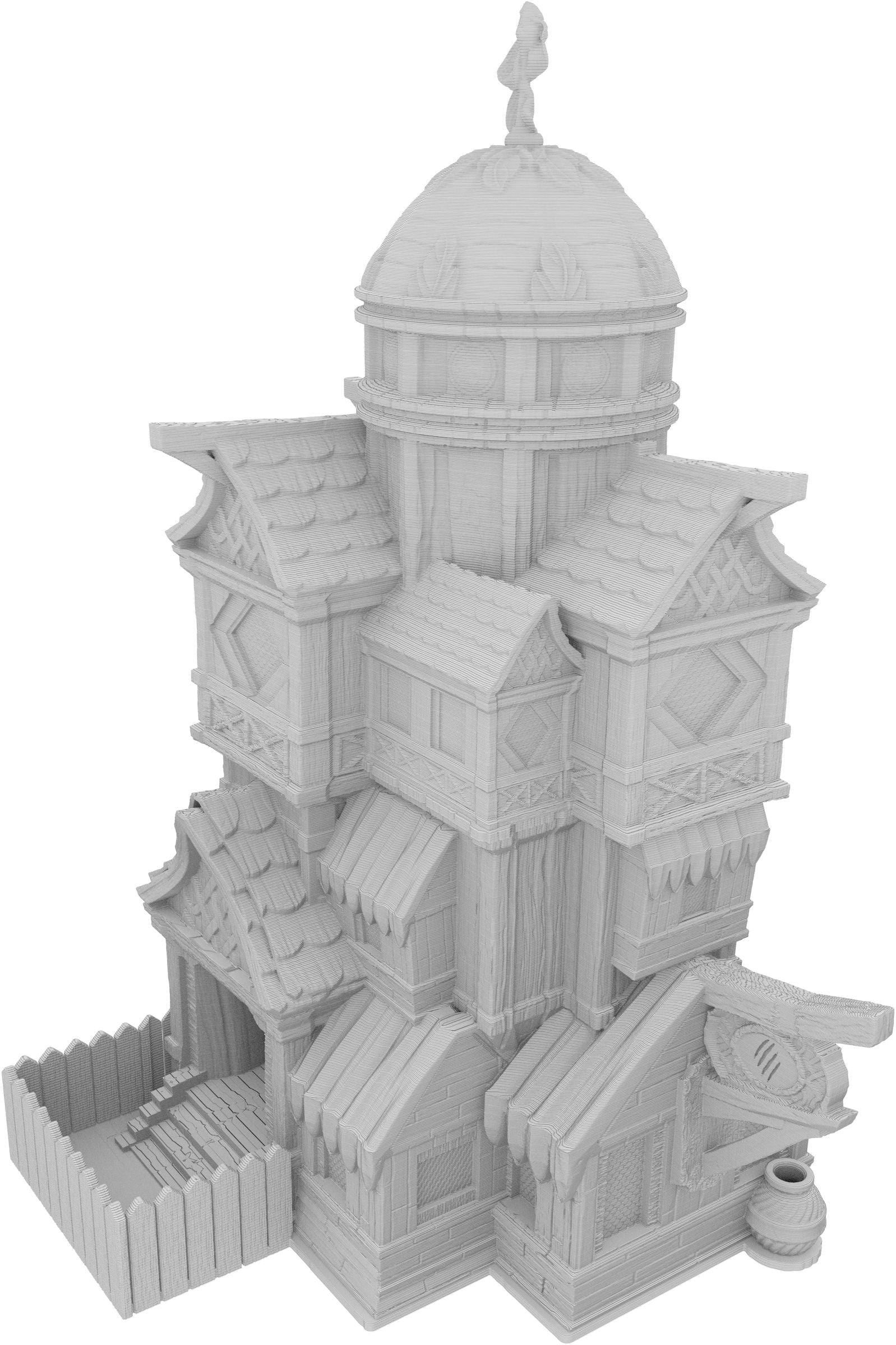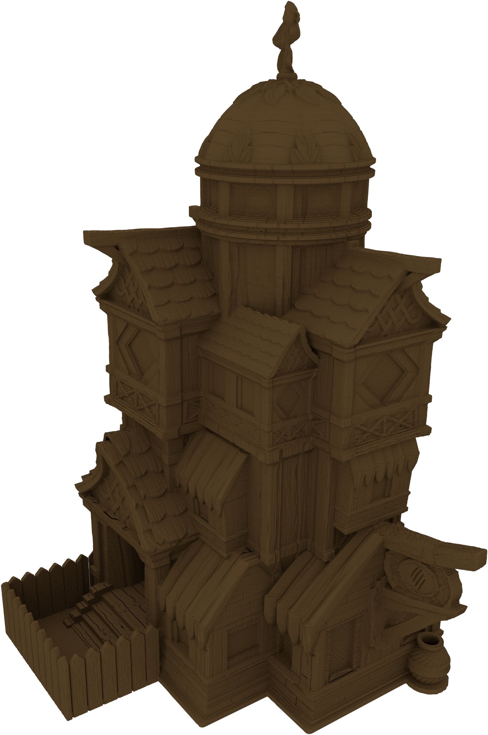 3D printed - detailed dice tower, with removable roof and exchangeable dice tray. The Dice Tower can also be used as a terrain part for your miniatures game or as a center piece for your next DnD session.