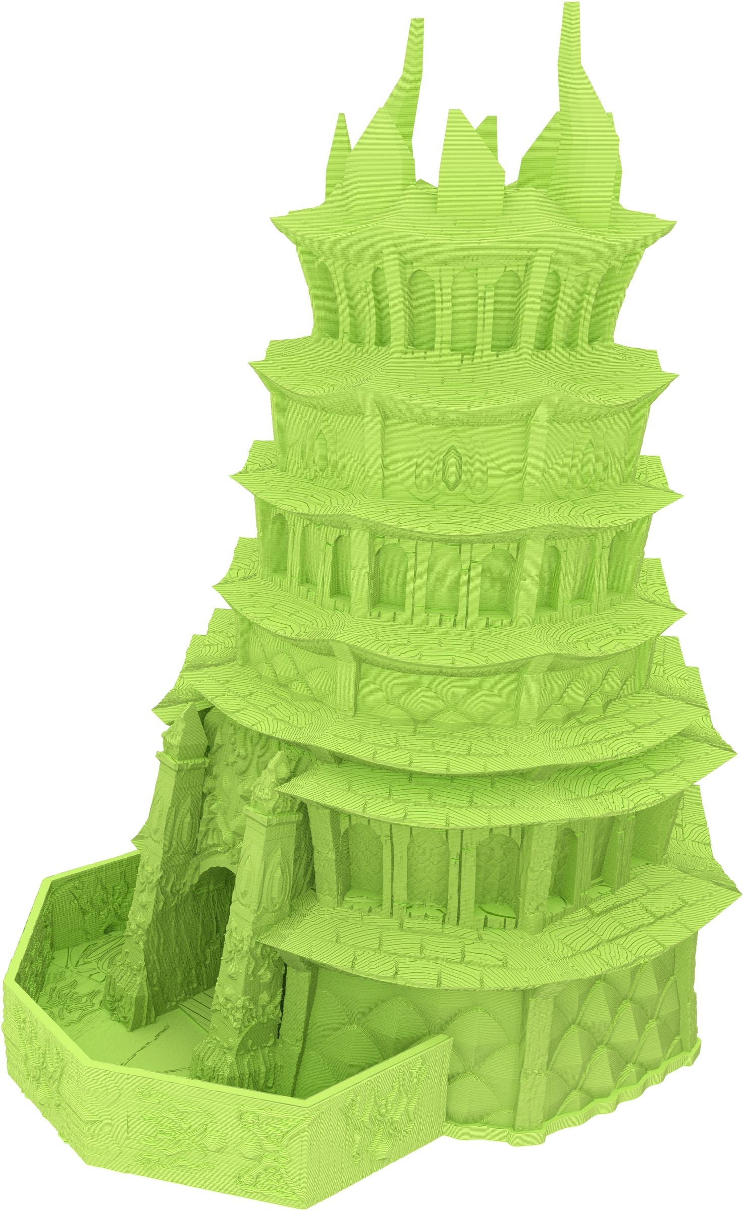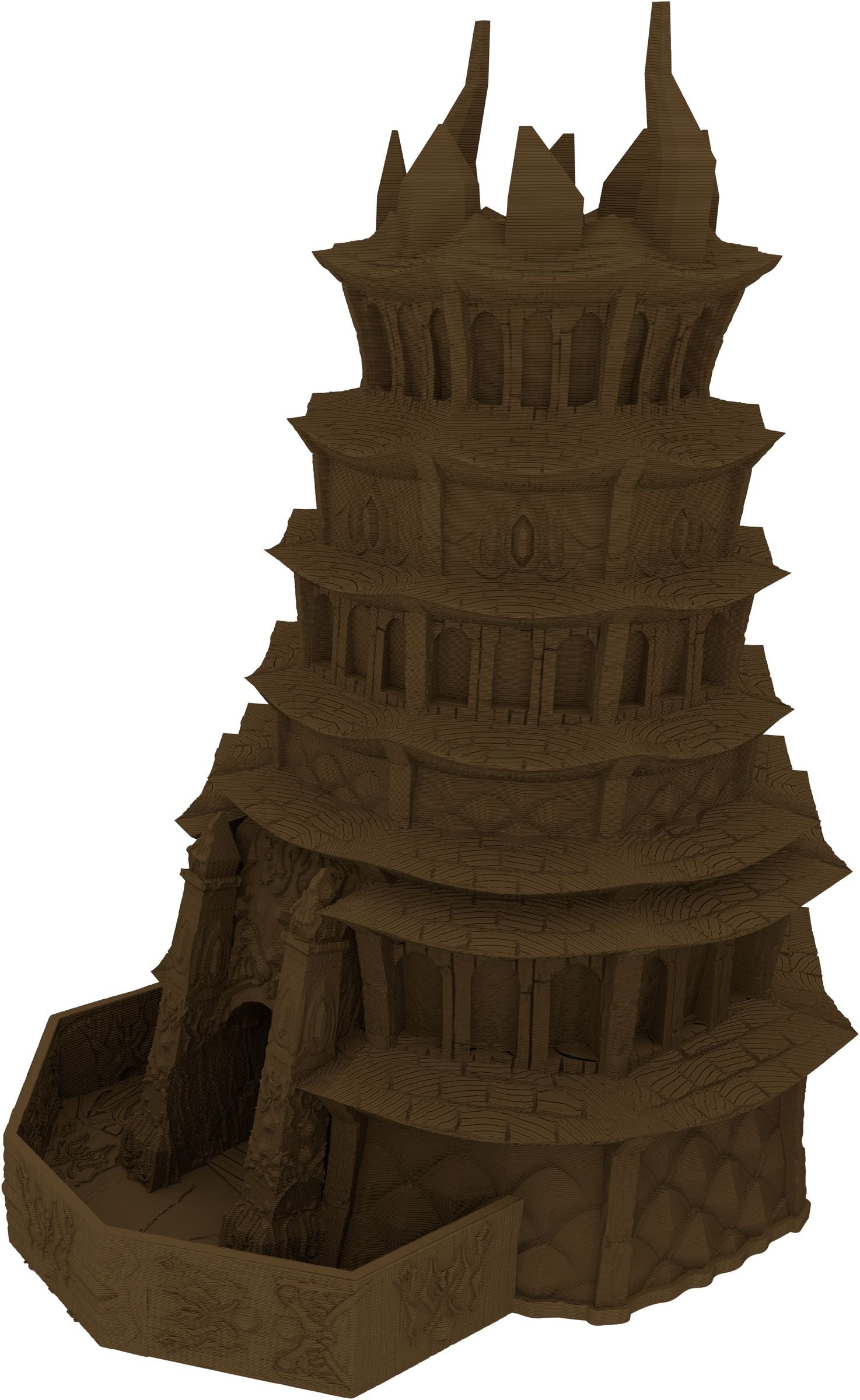 3D printed - detailed dice tower, with removable roof and exchangeable dice tray. The Dice Tower can also be used as a terrain part for your miniatures game or as a center piece for your next DnD session.