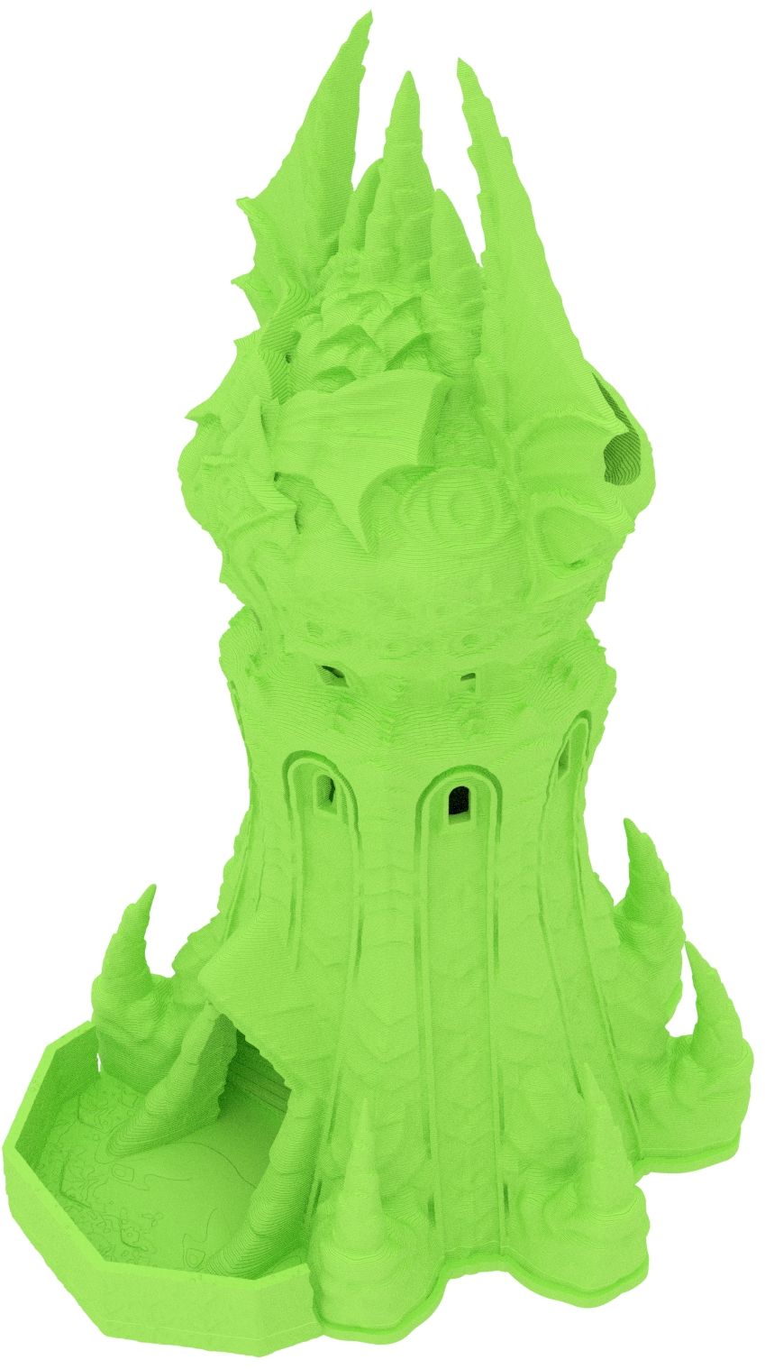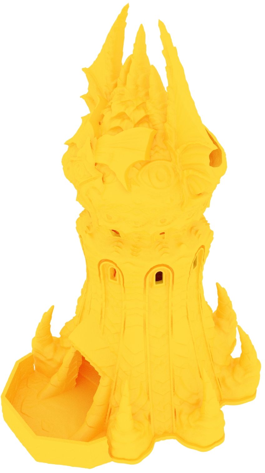 3D printed - detailed dice tower, with removable roof and exchangeable dice tray. The Dice Tower can also be used as a terrain part for your miniatures game or as a center piece for your next DnD session.